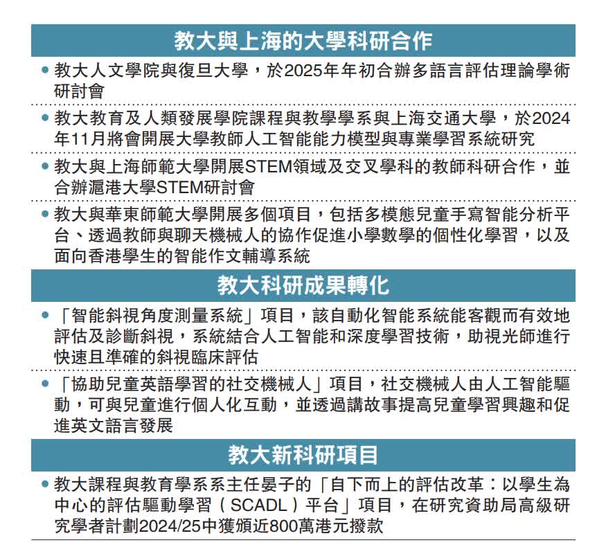 王敏娟續指,教大的全球新興技術研究所正準備與內地西部一間大學成立聯合AI實驗室,以此實驗室為基礎開發大語言模型,未來再加入工商業的合作夥伴,不局限於教育方面,「我正在做AI在中小學課堂應用的課程標準,項目已與杭州、西寧的學校合作,下一步是擴大至寧夏,也呼應校長推動的『一帶一路』工作,用AI技術助力西部教育發展。」