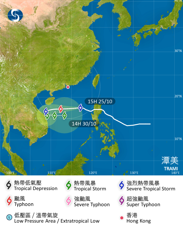 天文台指,過去數小時,潭美穩定向西北偏西方向移動,預料潭美明早在香港以南約500公里掠過。在潭美與東北季候風的共同影響下,本港離岸及高地間中吹強風,但由於主要吹偏北風,受地形屏蔽影響,本港今晚及明日初時普遍風力不會顯著增強。但隨着潭美逐漸移向本港西南面,本港明日稍後會轉吹偏東風,原先受屏蔽的地區可能會變得當風。而與潭美相關的雨帶亦會逐漸影響廣東沿岸。