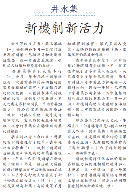 衞生署昨日宣布,藥品審批「1+」機制將於下月一日起拓展至所有新藥,包括疫苗和先進療法製品。這一措施意義深遠,受到病人組織和醫療界的歡迎。