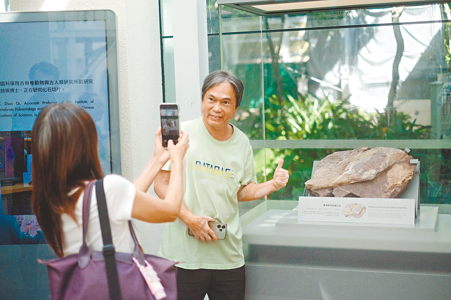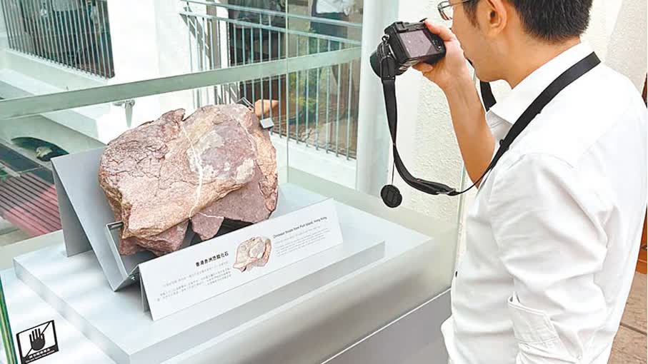 首次在香港發現的恐龍化石昨日開始展出,現場有屏幕展示有關化石的資料。古物古蹟辦事處一級助理館長吳國樑擔當導賞員,為市民講解發現恐龍化石的經過及其資料。他表示,導賞服務只是暫時安排,未來會再培訓導賞員。