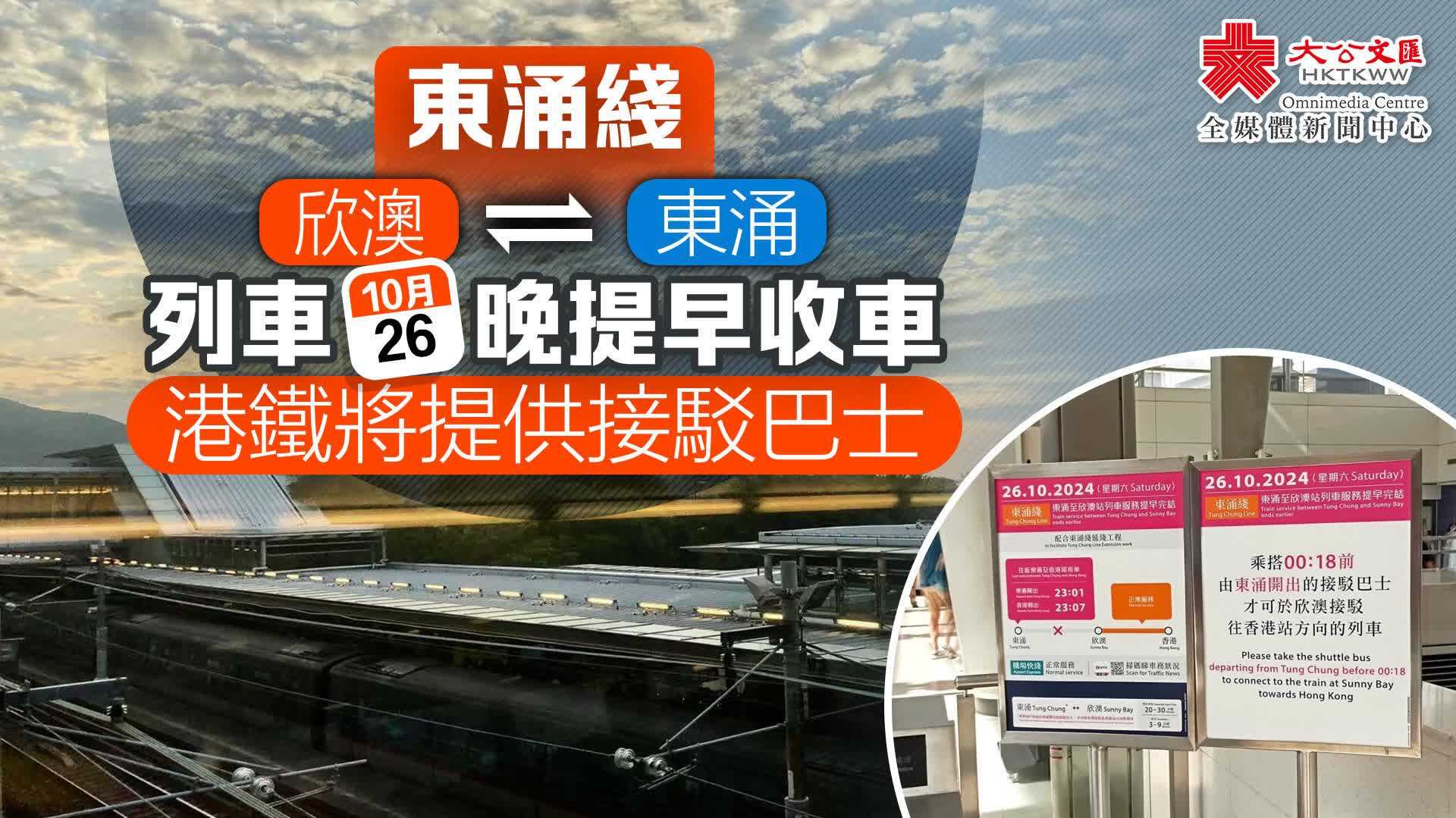 東涌綫由東涌往香港站的尾班車,將於11時01分於東涌站開出;由香港站往東涌站的尾班車,則會於11時07分於香港站開出。欣澳至香港站維持正常服務,港鐵將安排免費接駁巴士往返東涌站及欣澳站。