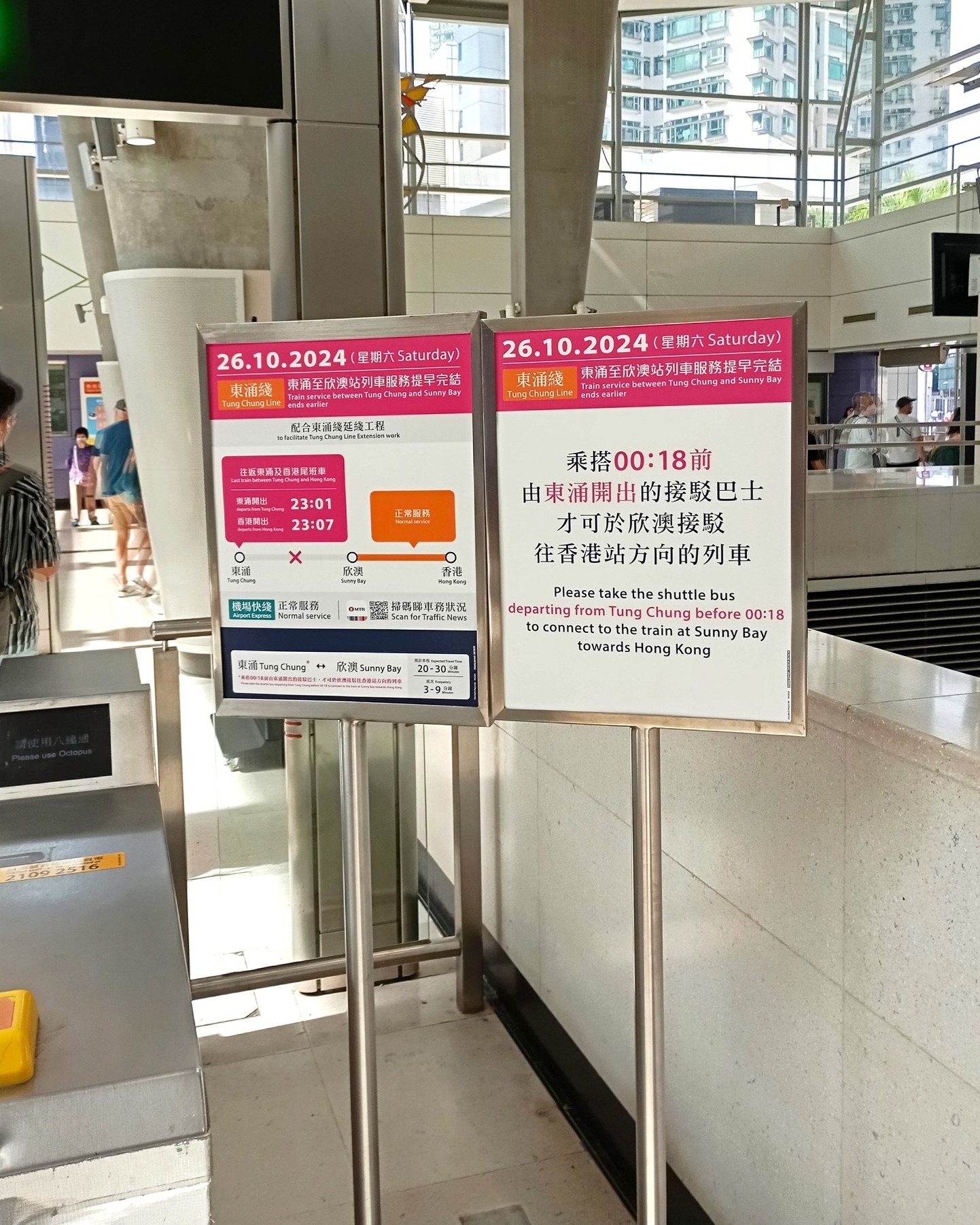 港鐵提醒,只有乘搭凌晨12時18分前,由東涌開出的接駁巴士,才可於欣澳站接駁往香港站方向的列車。