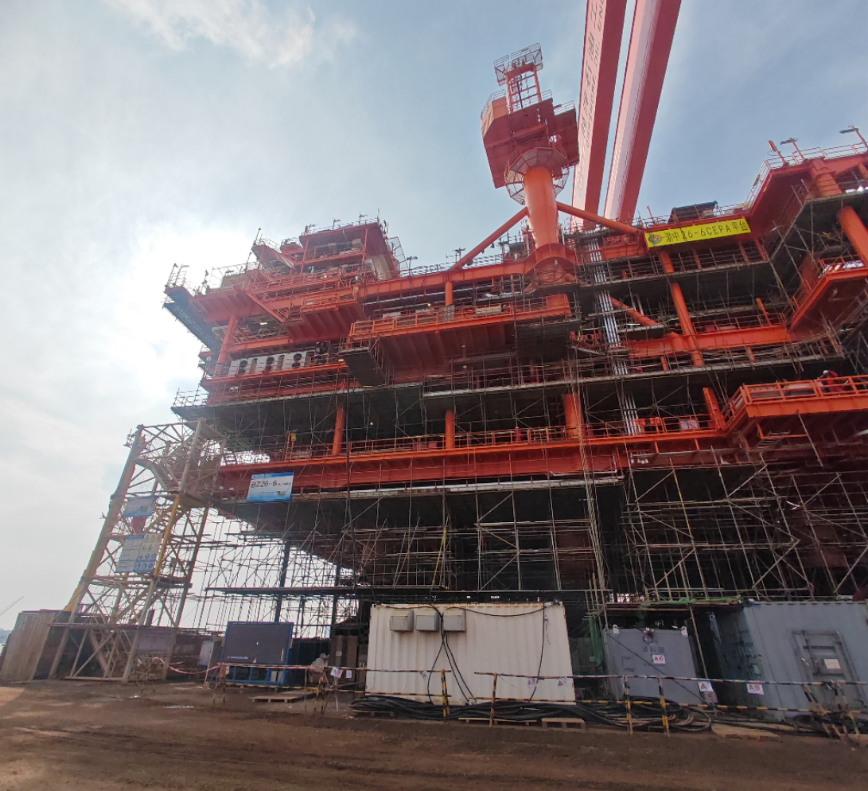 在海洋石油工程(青島)有限公司,記者看到全球最大變質岩油田中心平台渤中26-6 CEPA平台正在建設中。這是一座集生產、生活為一體的3層8腿多功能綜合海洋油氣平台,高22.8米,相當於8層居民樓的高度,長86.3米、寬69.1米,投影面積超過14個標準籃球場大小,包括生產分離器、段塞流捕集器、閃蒸汽壓縮機等160餘台套生產設備以及一座可以容納60人同時工作生活的生活樓,總重約18000噸,是目前渤海油田最重的平台,將於11月運往海上進行浮托安裝和連接調試工作。