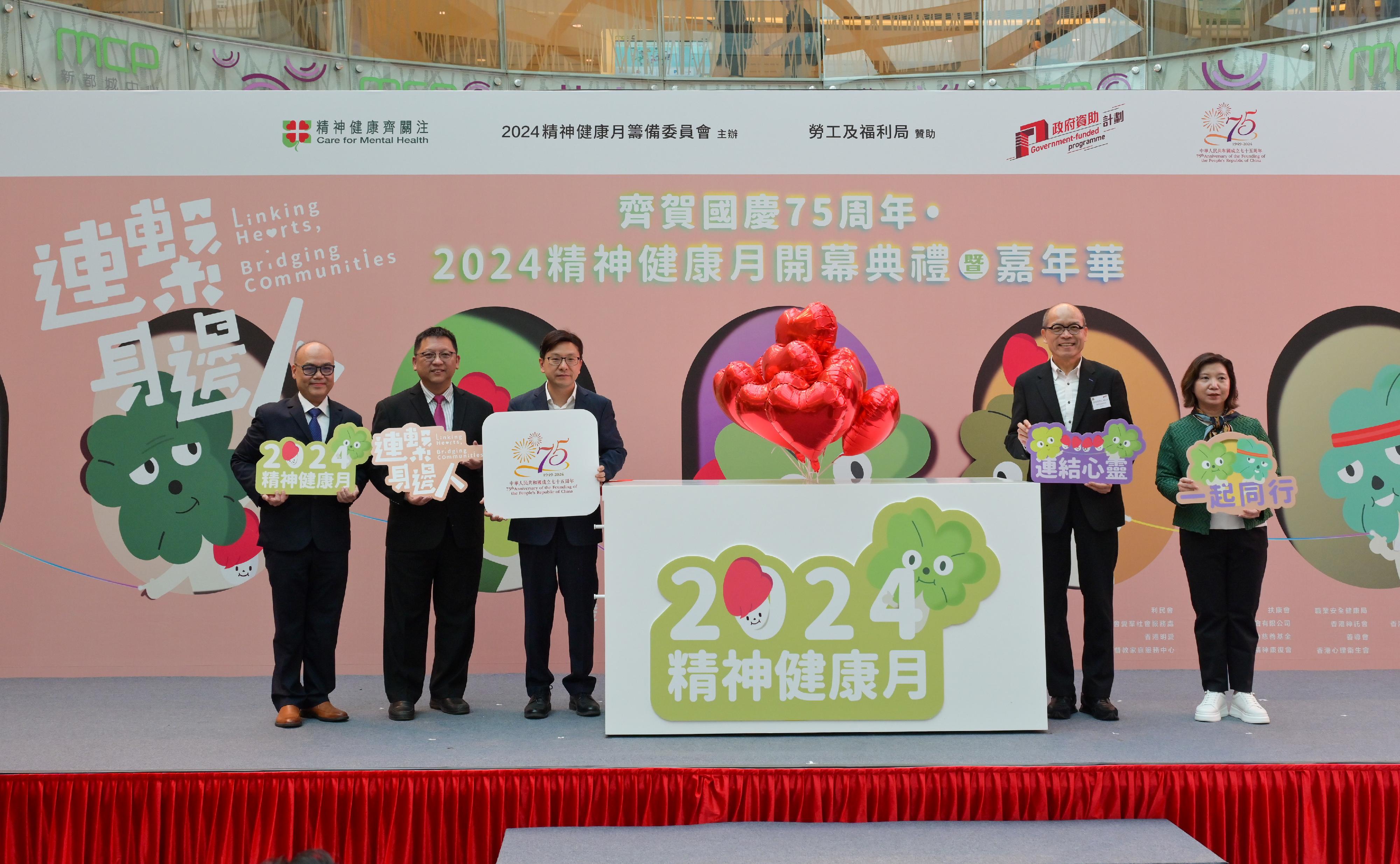 勞工及福利局局長孫玉菡今日(十月二十六日)為「齊賀國慶75周年.2024精神健康月開幕典禮暨嘉年華」主禮。精神健康月由勞工及福利局聯同多個決策局/部門、公營機構及非政府機構合辦,以響應世界心理衞生聯盟發起的「世界精神衞生日」。2024精神健康月以「連繫身邊人」為主題,宣揚精神健康的重要性,並呼籲公眾關注照顧者及鼓勵精神復元人士融入職場。圖示(左起)2024精神健康月籌備委員會主席黃建隆博士、勞工及福利局康復專員陳偉偉、孫玉菡、康復諮詢委員會副主席劉健華博士及社會福利署助理署長(康復及醫務社會服務)梁綺莉主持開幕儀式。