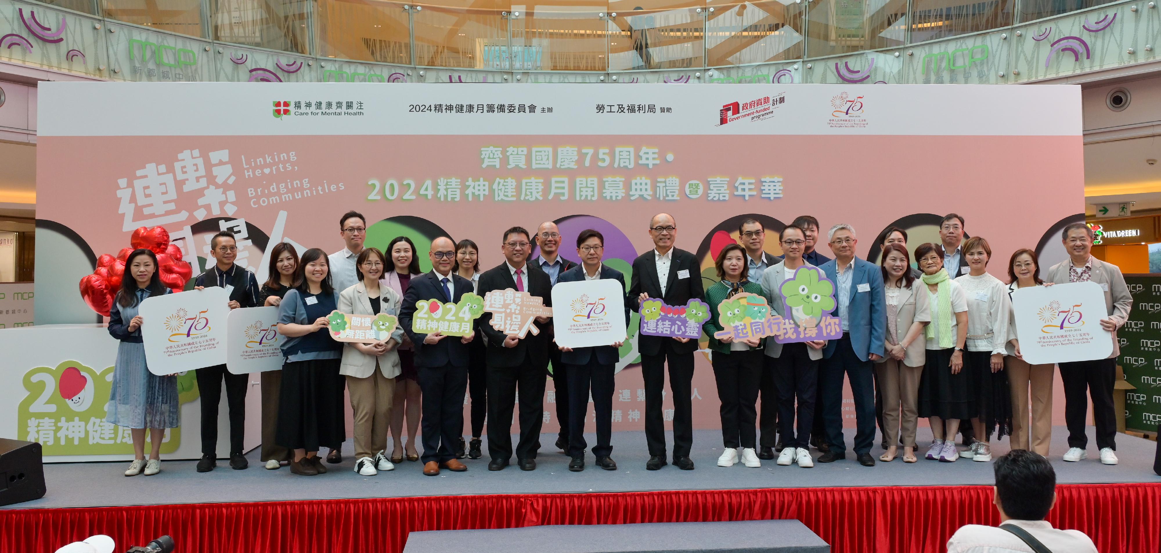 勞工及福利局局長孫玉菡今日(十月二十六日)為「齊賀國慶75周年.2024精神健康月開幕典禮暨嘉年華」主禮。精神健康月由勞工及福利局聯同多個決策局/部門、公營機構及非政府機構合辦,以響應世界心理衞生聯盟發起的「世界精神衞生日」。2024精神健康月以「連繫身邊人」為主題,宣揚精神健康的重要性,並呼籲公眾關注照顧者及鼓勵精神復元人士融入職場。圖示(前排左三起)2024精神健康月籌備委員會主席黃建隆博士、勞工及福利局康復專員陳偉偉、孫玉菡、康復諮詢委員會副主席劉健華博士及社會福利署助理署長(康復及醫務社會服務)梁綺莉與合辦機構代表合照。