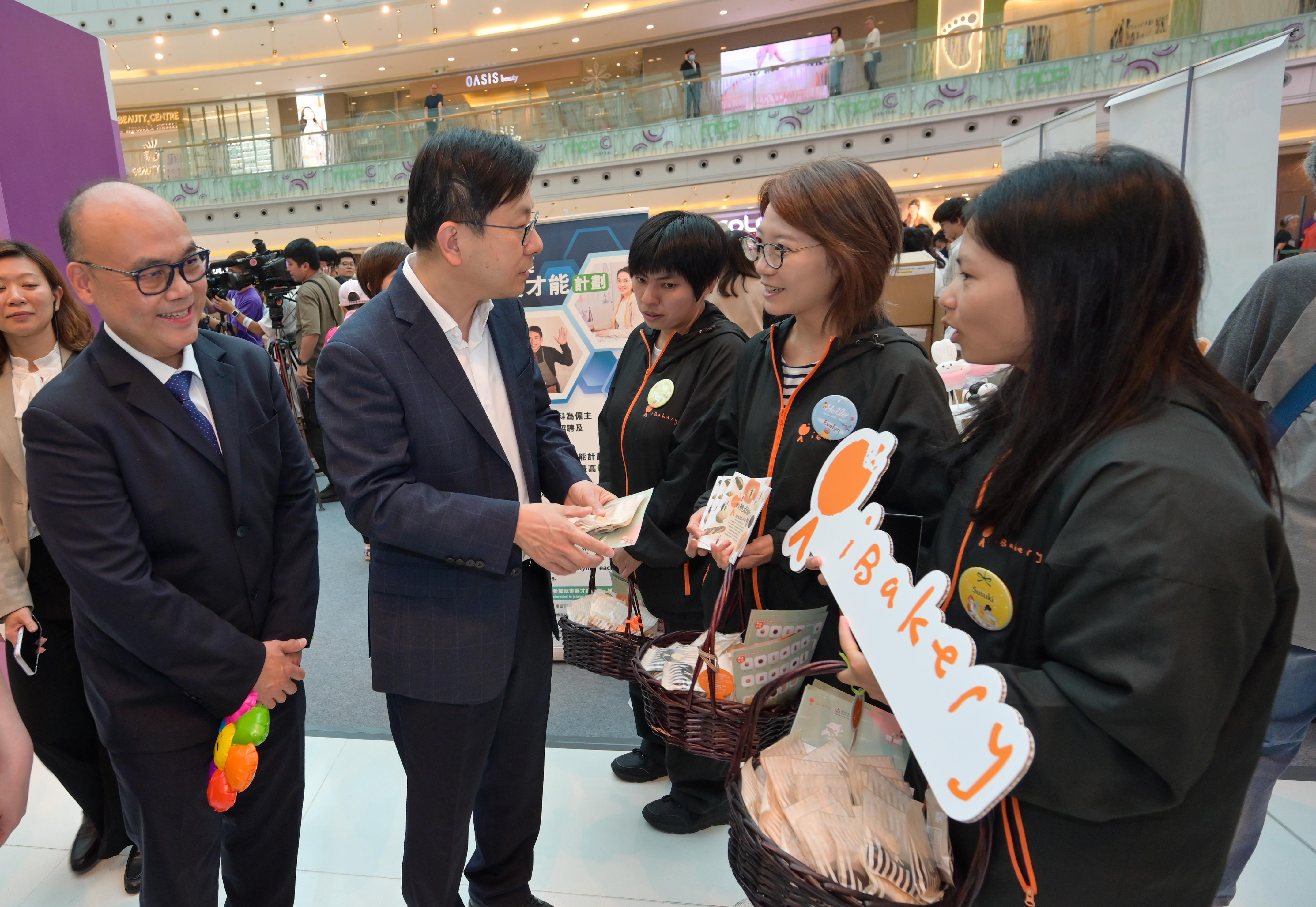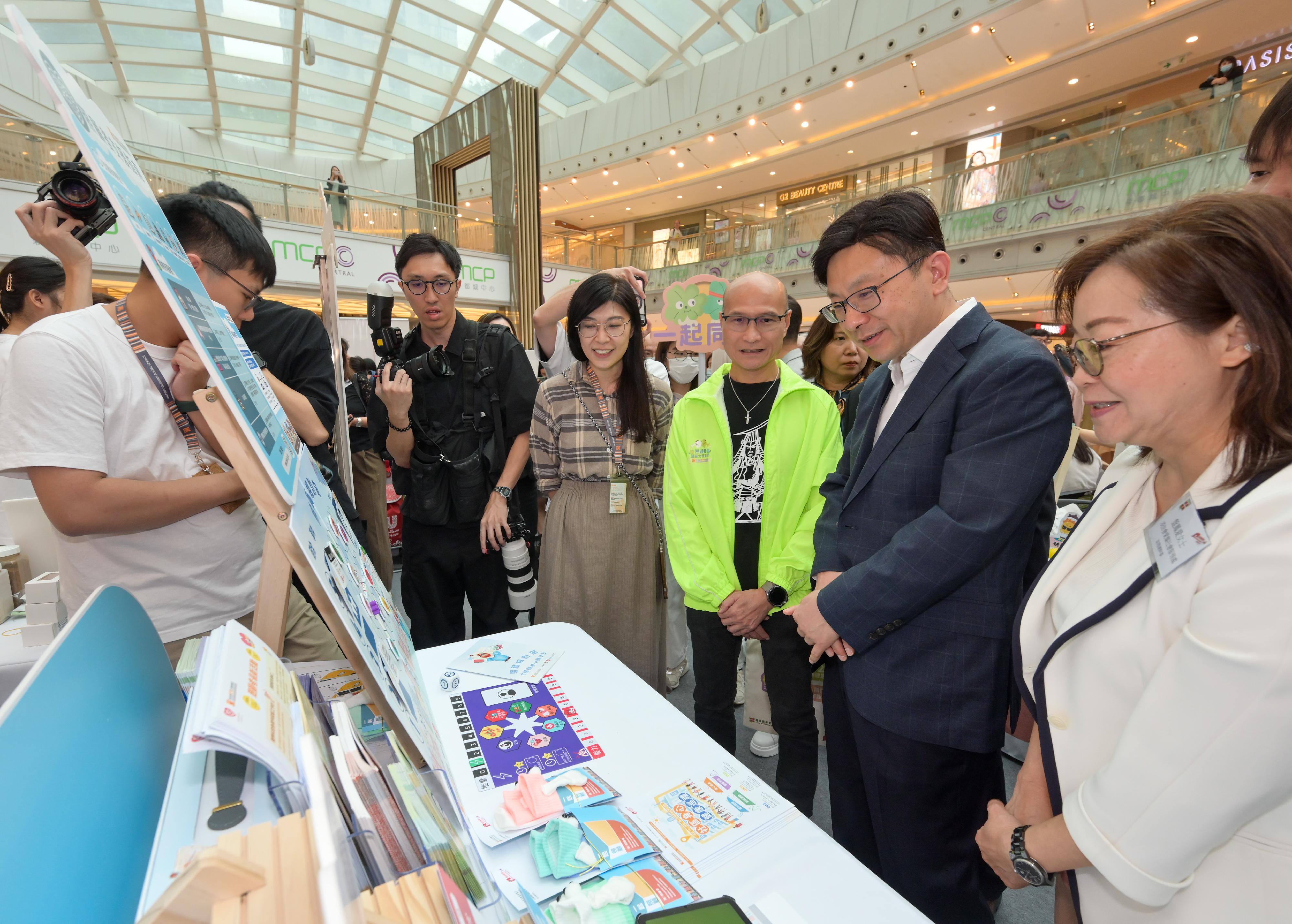 勞工及福利局局長孫玉菡今日(十月二十六日)為「齊賀國慶75周年.2024精神健康月開幕典禮暨嘉年華」主禮。精神健康月由勞工及福利局聯同多個決策局/部門、公營機構及非政府機構合辦,以響應世界心理衞生聯盟發起的「世界精神衞生日」。2024精神健康月以「連繫身邊人」為主題,宣揚精神健康的重要性,並呼籲公眾關注照顧者及鼓勵精神復元人士融入職場。圖示孫玉菡(左二)參觀勞工處及社會福利署攤位,了解團隊如何支援精神復元人士就業。