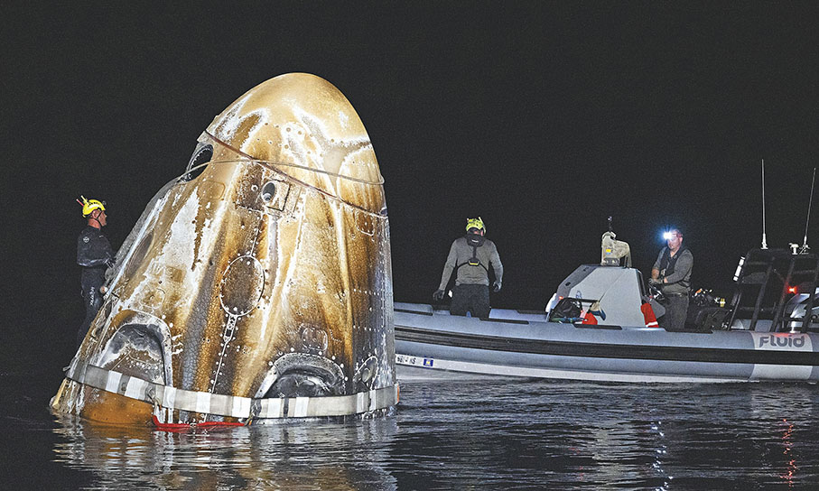 《紐約時報》報道,「龍」飛船今次接回的4名太空人分別是美國人多米尼克、巴拉克和艾普斯,以及俄羅斯籍太空人格雷本金。他們於今年3月升空進入國際太空站,原定任務期限為6個月。「龍」飛船當日返回地球、墜入墨西哥灣指定位置,其間沒有出現任何技術問題。回收船的影片顯示,4名太空人都順利離開太空艙。NASA早前指他們4人均接受初步健康檢查,其後表示一人住院。