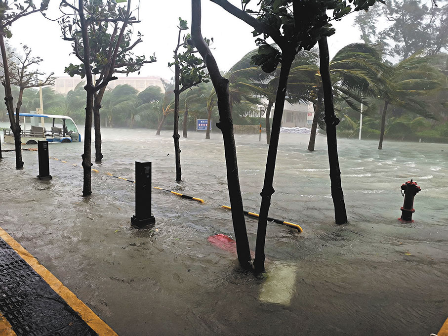 「潭美」不僅給永興島帶來了狂風暴雨和巨浪,還使島上出現了罕見的「海水倒灌」,路面積水嚴重。三沙市氣象台台長邢俊分析稱,這主要是由於颱風製造了風暴增水。