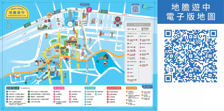 韋志成提到,市建局亦特別製作「地膽遊中」地圖,透過色彩繽紛的圖像及街道圖,呈現「地膽遊中」活動的各個主體景點和AR位置,讓更多導賞團以外的市民和旅客,無論是手持實體地圖,或是以網頁版地圖形式,皆能自由出行、探索和體驗中上環的魅力。