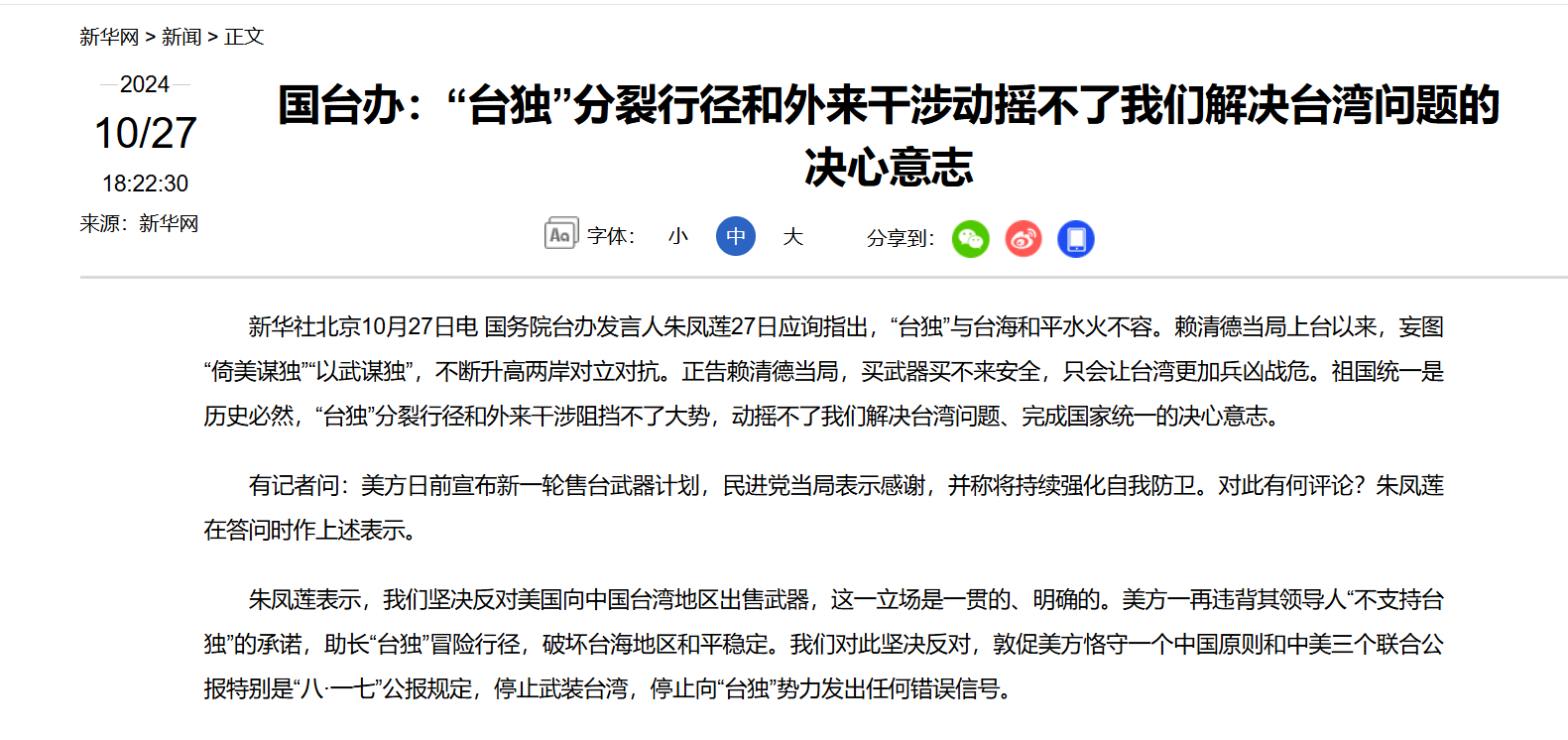 國台辦發言人朱鳳蓮今日(27日)回應指出,「台獨」與台海和平水火不容。賴清德當局上台以來,妄圖「倚美謀獨」「以武謀獨」,不斷升高兩岸對立對抗。國台辦正告賴清德當局,買武器買不來安全,只會讓台灣更加兵凶戰危。祖國統一是歷史必然,「台獨」分裂行徑和外來干涉阻擋不了大勢,動搖不了我們解決台灣問題、完成國家統一的決心意志。