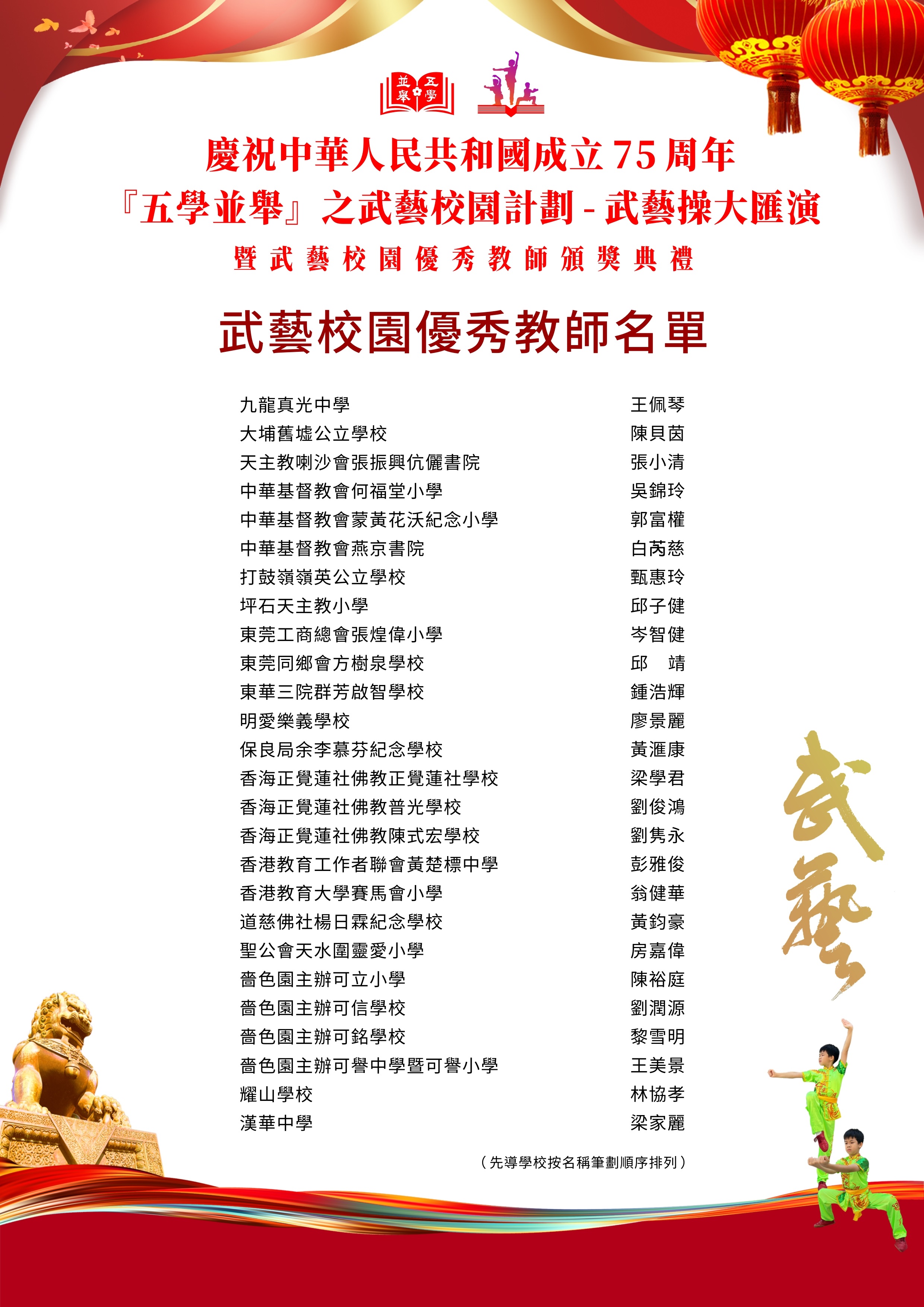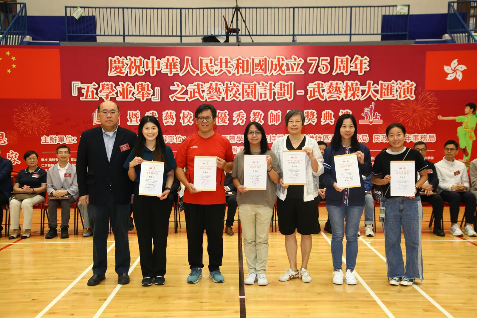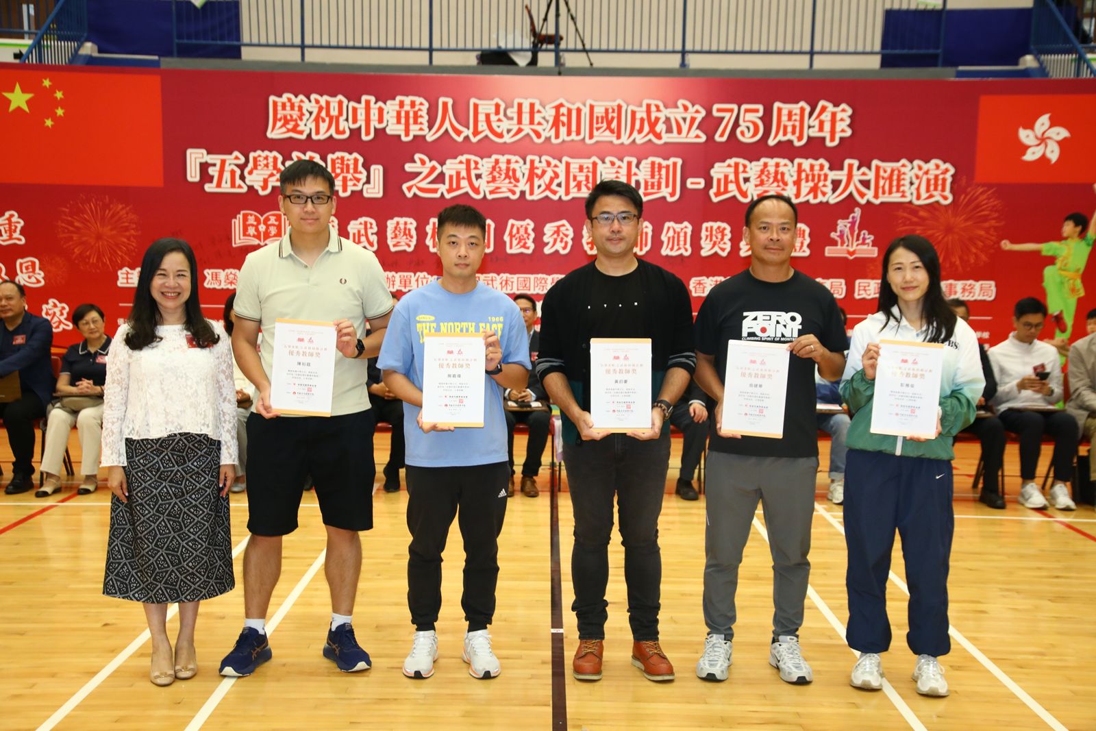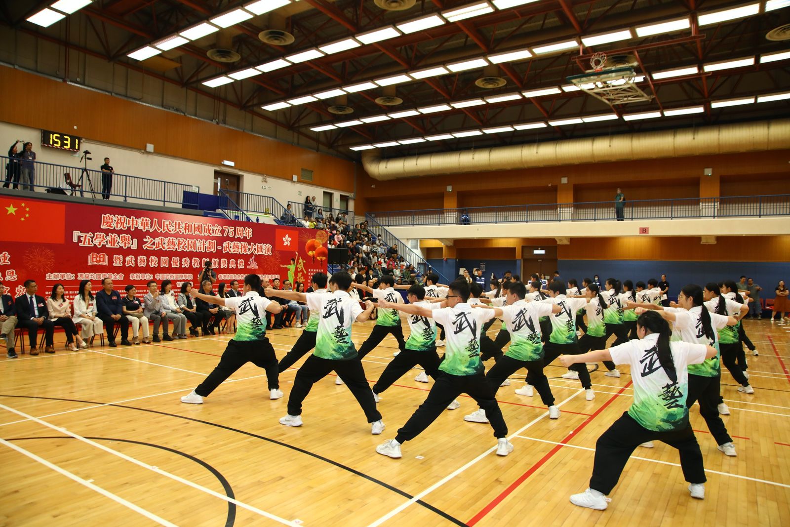 大公文匯全媒體報道,為慶祝中華人民共和國成立75周年,「『五學並舉』之武藝校園計劃-武藝操大匯演」今日(27日)在林士德體育館舉辦,24所中小學(包括特殊學校)共400名學生參加,匯演體現文化自信和國家認同,香港中小學生共同以中國武術精神為強大祖國獻禮致敬。