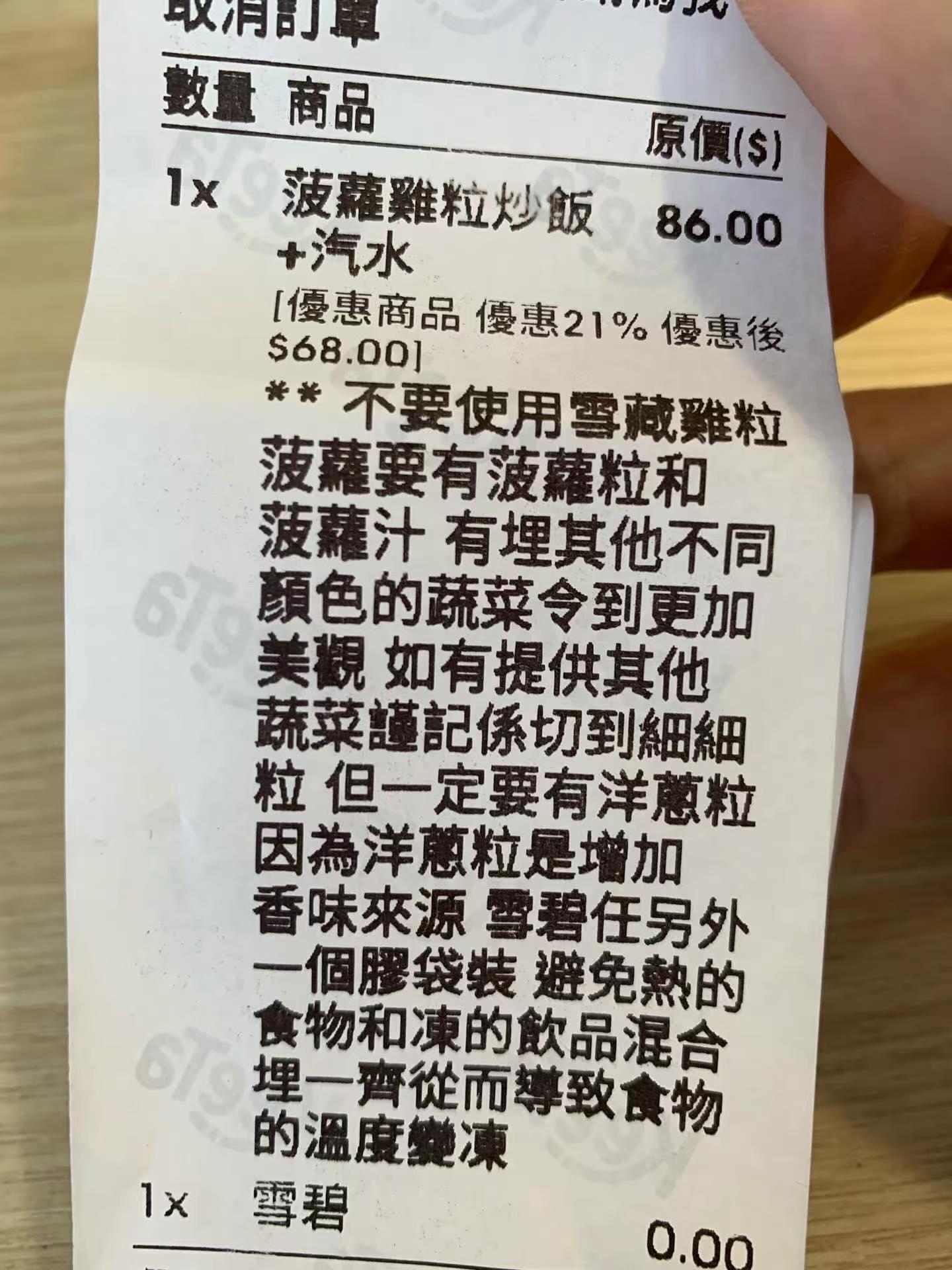 樓主上傳的圖片顯示,外賣單訂購的產品為「菠蘿雞粒炒飯+汽水」,價格共86元,優惠21%後,實收68元。當中最觸目的是客人在下單時,提出逾一百字的附註要求。要求寫道:「不要使用雪藏雞粒,菠蘿要有菠蘿粒和菠蘿汁,有埋其他不同顏色的蔬菜,令到更加美觀,如有提供其他蔬菜謹記係切到細細粒,但一定要有洋蔥粒,因為洋蔥粒是增加香味來源,雪碧任(放)另外一個膠袋裝,避免熱的食物和凍的飲品混合埋一齊,從而導致食物的溫度變凍。」樓主配文稱,「笑到我粒XX有腹肌」。