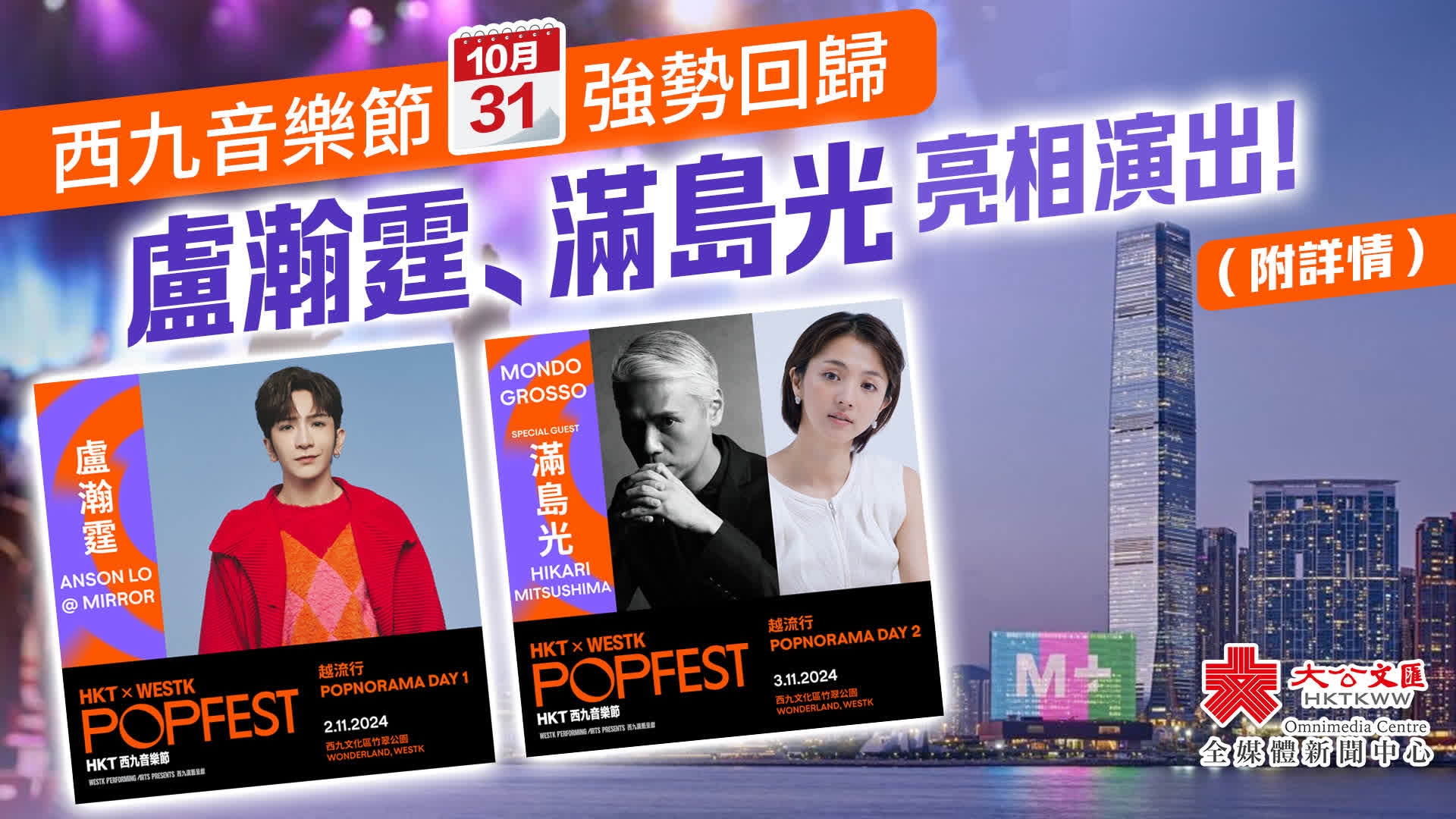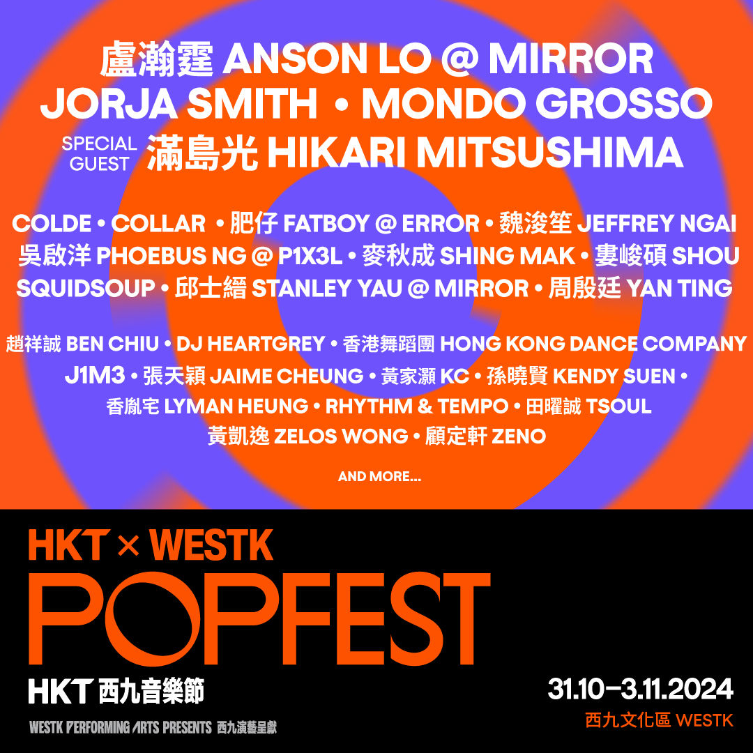 音樂節焦點節目之一《HKT西九音樂節:越流行》將於西九文化區標誌性大型戶外舞台——竹翠公園上演,一連兩晚(11月2日及3日)呈獻共10組來自香港及海外灸手可熱的歌手及演出單位!首晚(11月2日)率先呈獻本地大熱偶像陣容,翌晚(11月3日)由來自英國、日本、韓國及台灣的人氣音樂單位輪流上陣,勢將音樂節氣氛推向最高峰!