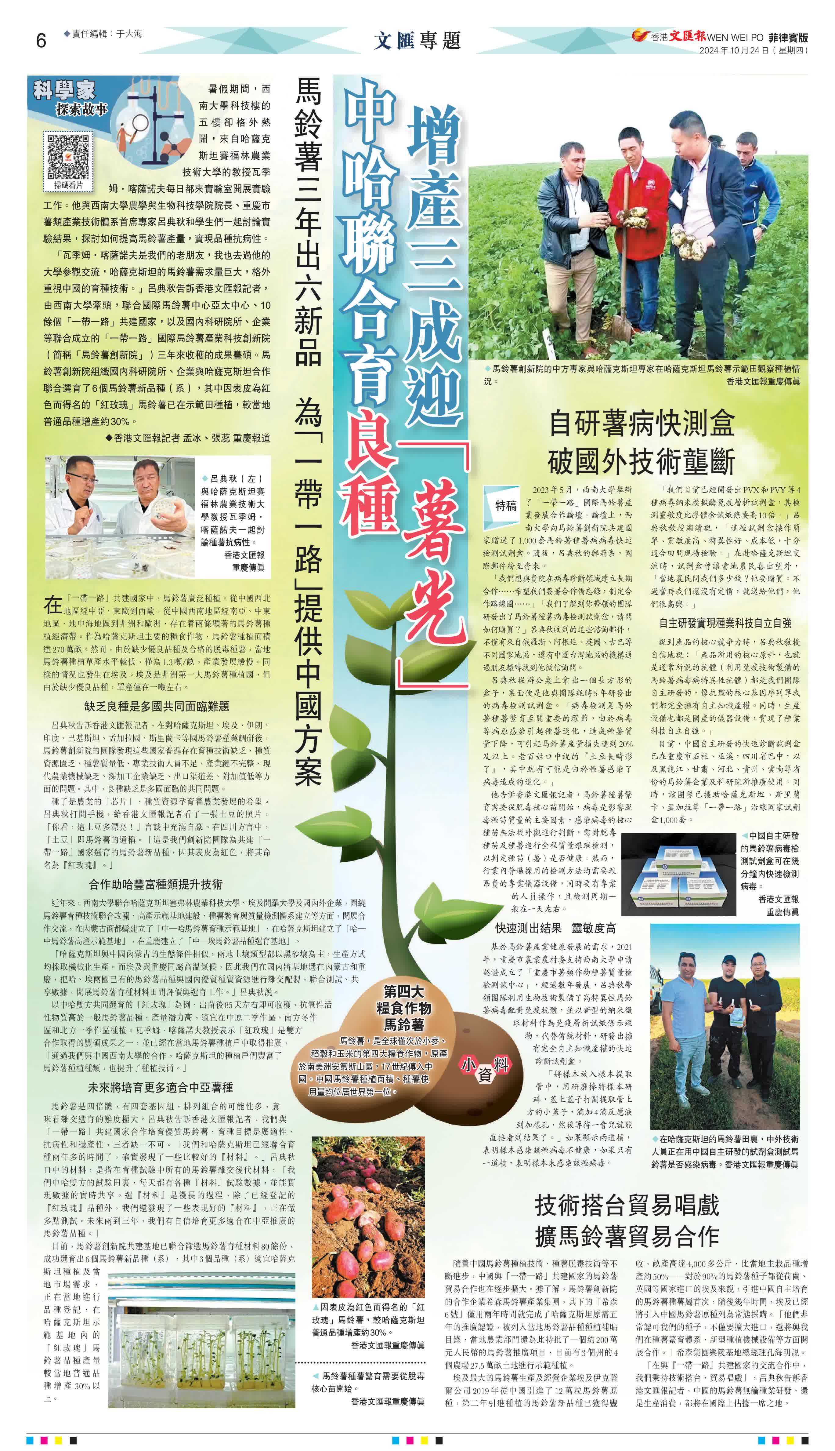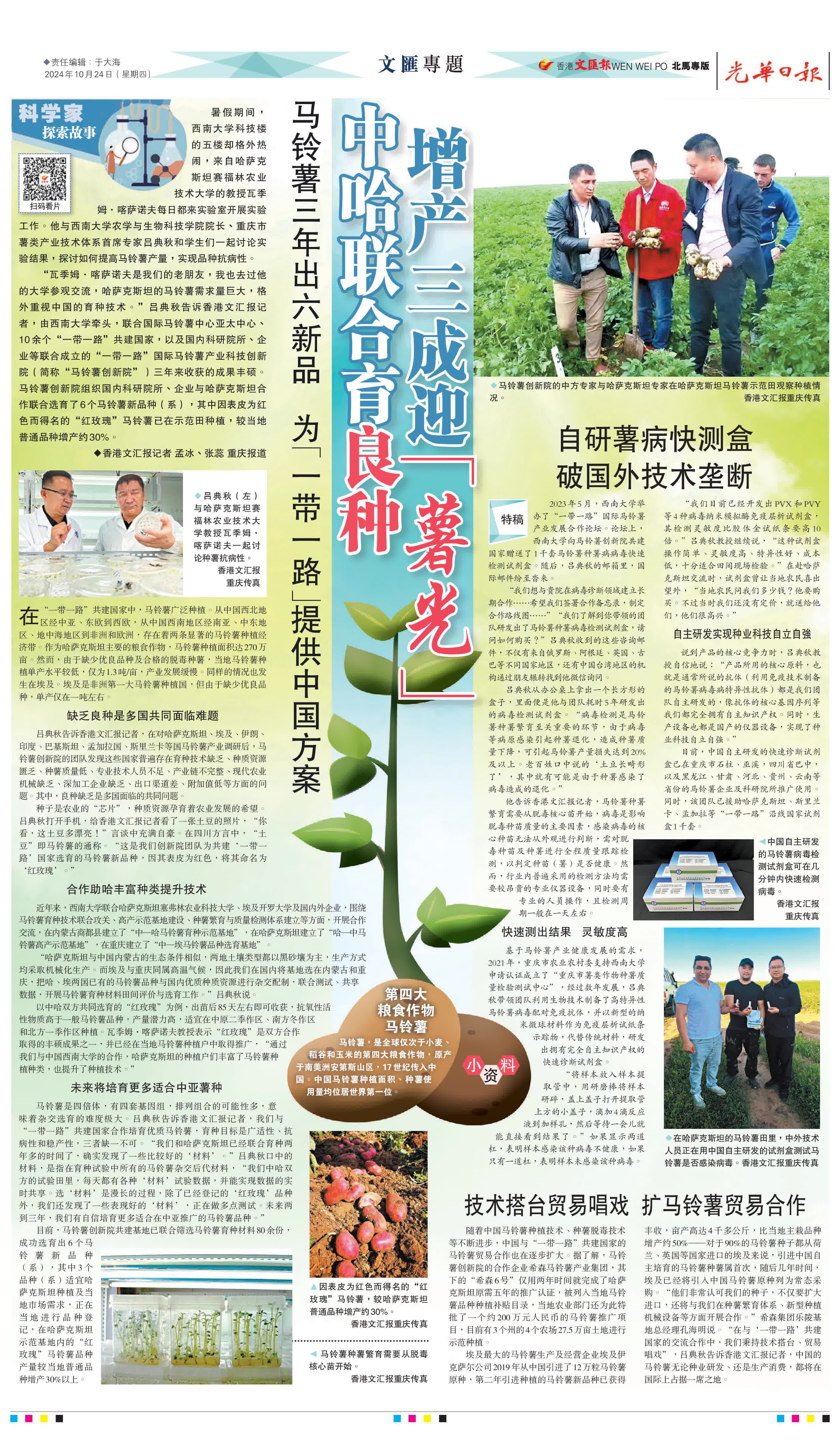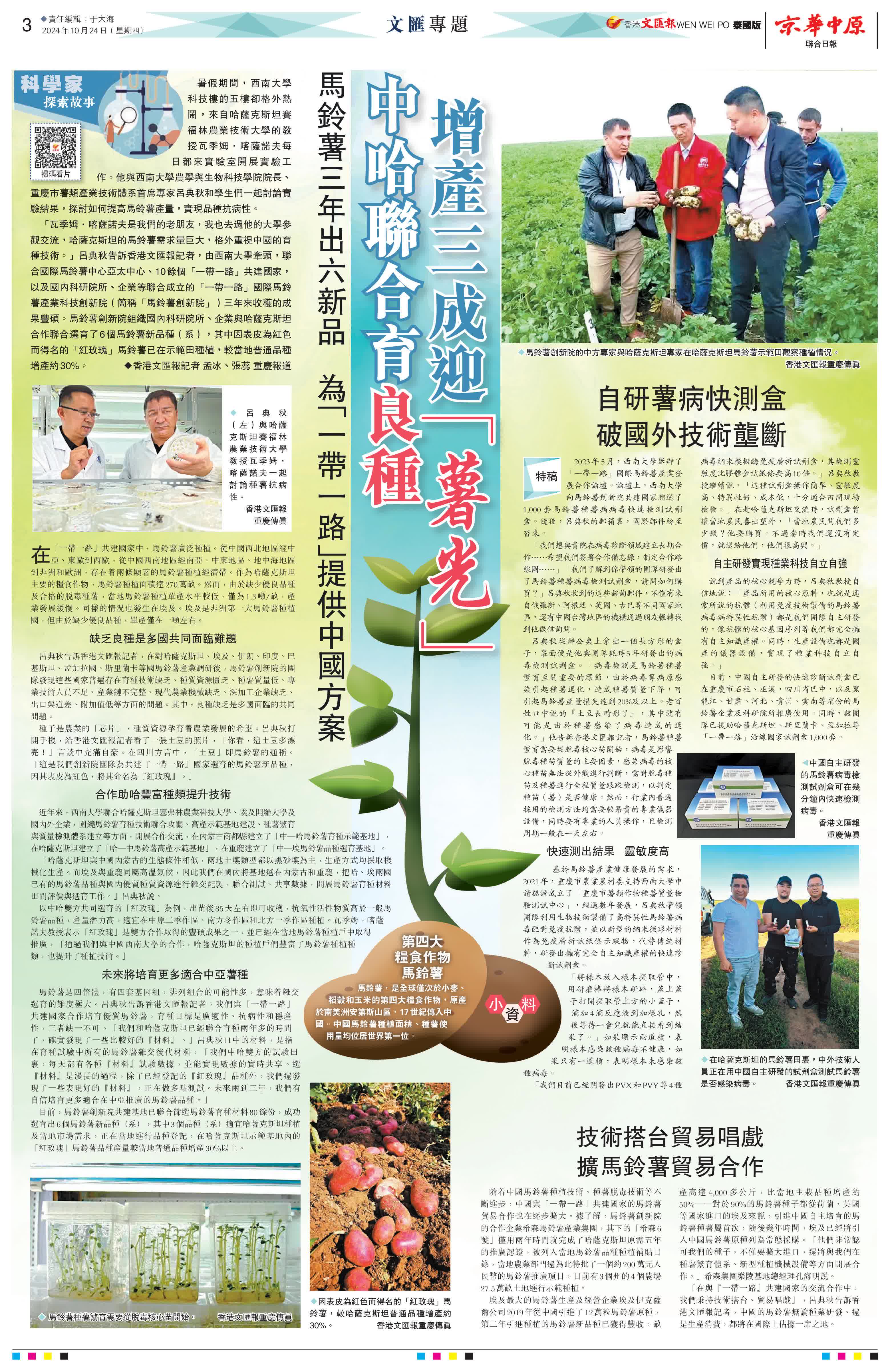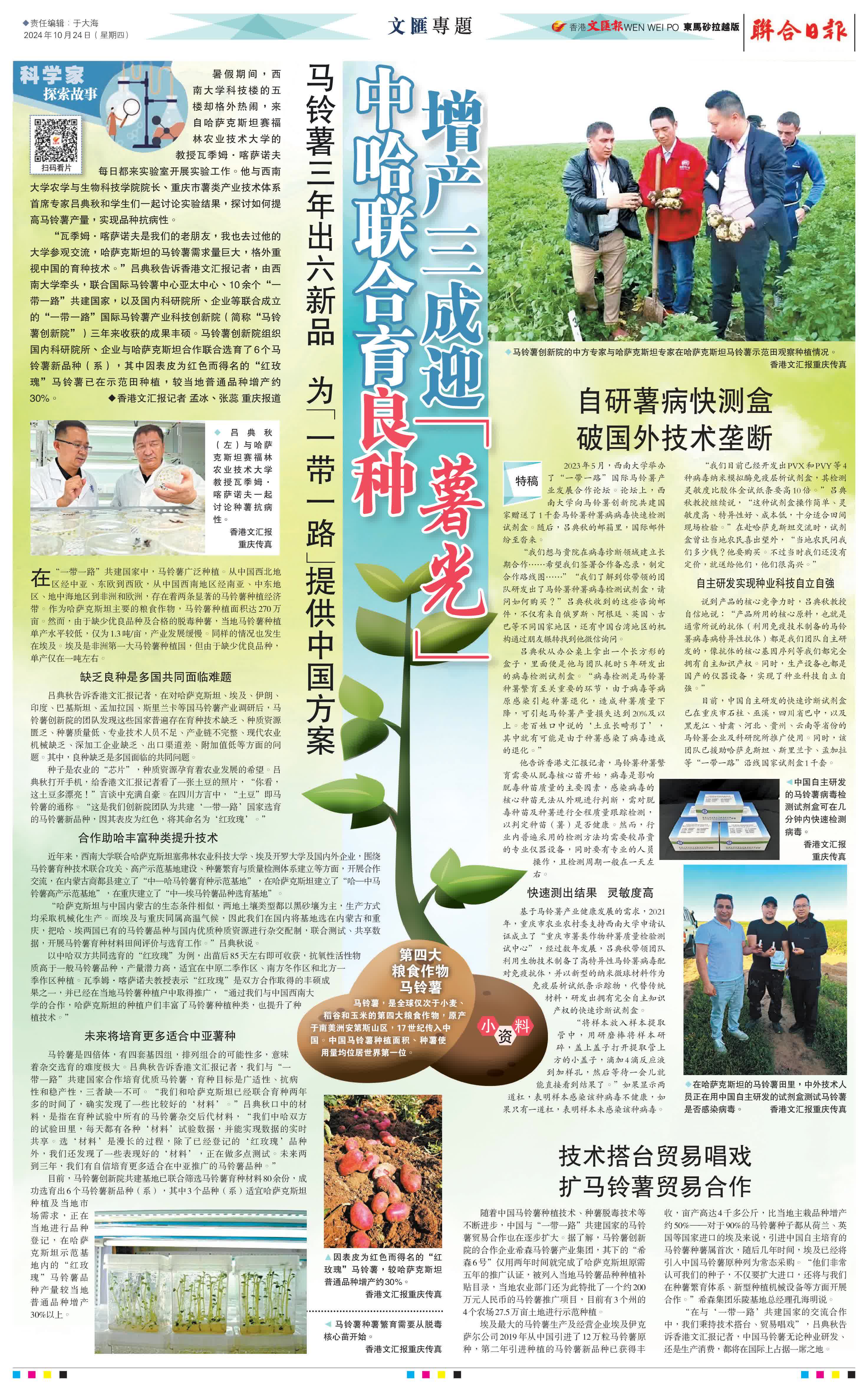 10月24日,《京華中原》《光華日報》《聯合日報》等多家海外華媒關注到來自哈薩克斯坦賽福林農業技術大學的教授瓦季姆·喀薩諾夫,他每日都到西南大學科技樓的五樓實驗室開展實驗工作,與西南大學農學與生物科技學院院長、重慶市薯類產業技術體系首席專家呂典秋和學生們一起討論實驗結果,探討如何提高馬鈴薯產量,實現品種抗病性。海外華媒同時對馬鈴薯創新院組織國內科研院所、企業與哈薩克斯坦合作聯合選育了6個馬鈴薯新品種(系),其中因表皮為紅色而得名的「紅玫瑰」馬鈴薯已在示範田種植,較當地普通品種增產約30%等內容進行了報道。