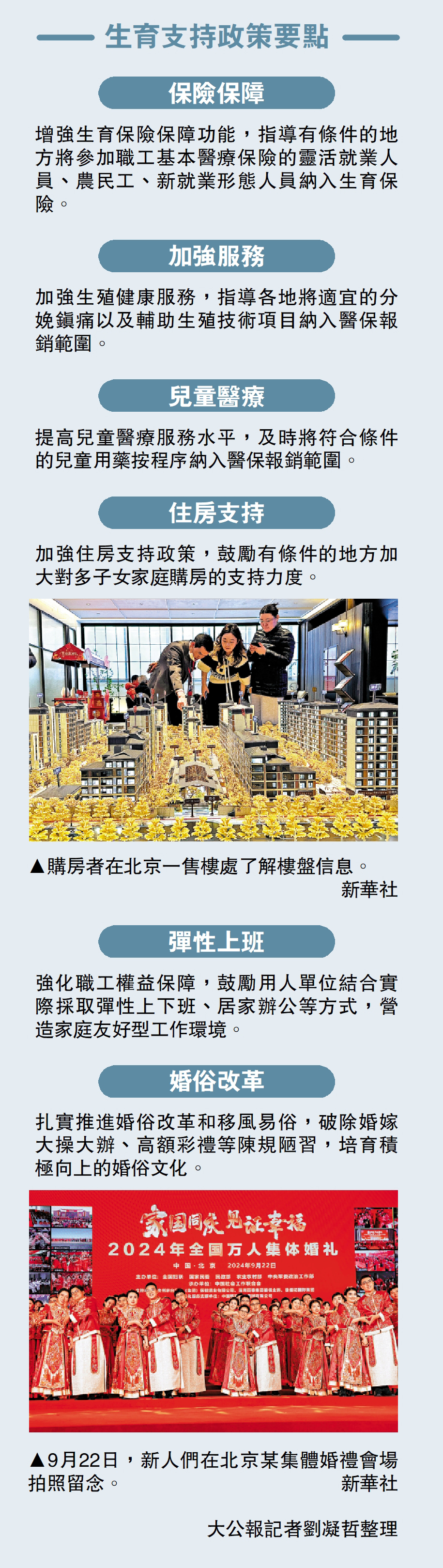 (大公報記者 劉凝哲北京報道)國務院辦公廳日前印發《關於加快完善生育支持政策體系推動建設生育友好型社會的若干措施》(下稱:《措施》),提出4方面13項生育支持措施,降低生育、養育、教育成本。具體包括,指導各地將輔助生殖技術項目納入醫保報銷範圍;鼓勵有條件的地方加大對多子女家庭購房的支持力度;鼓勵用人單位結合實際採取彈性上下班、居家辦公等方式,營造家庭友好型工作環境等受關注的措施。公眾對此次系列政策普遍抱有期待,希望能夠盡快落地,嚴格執行。
