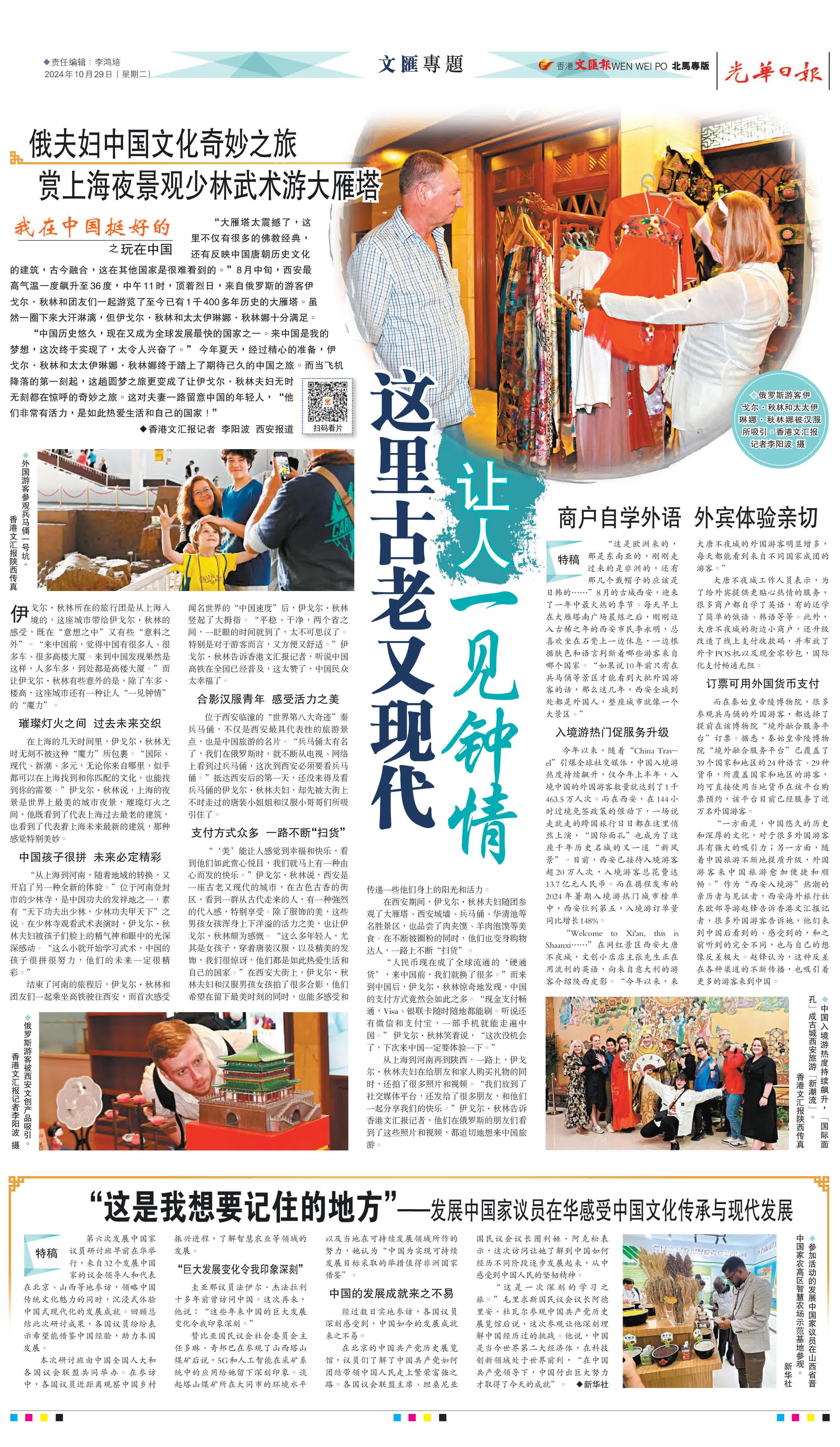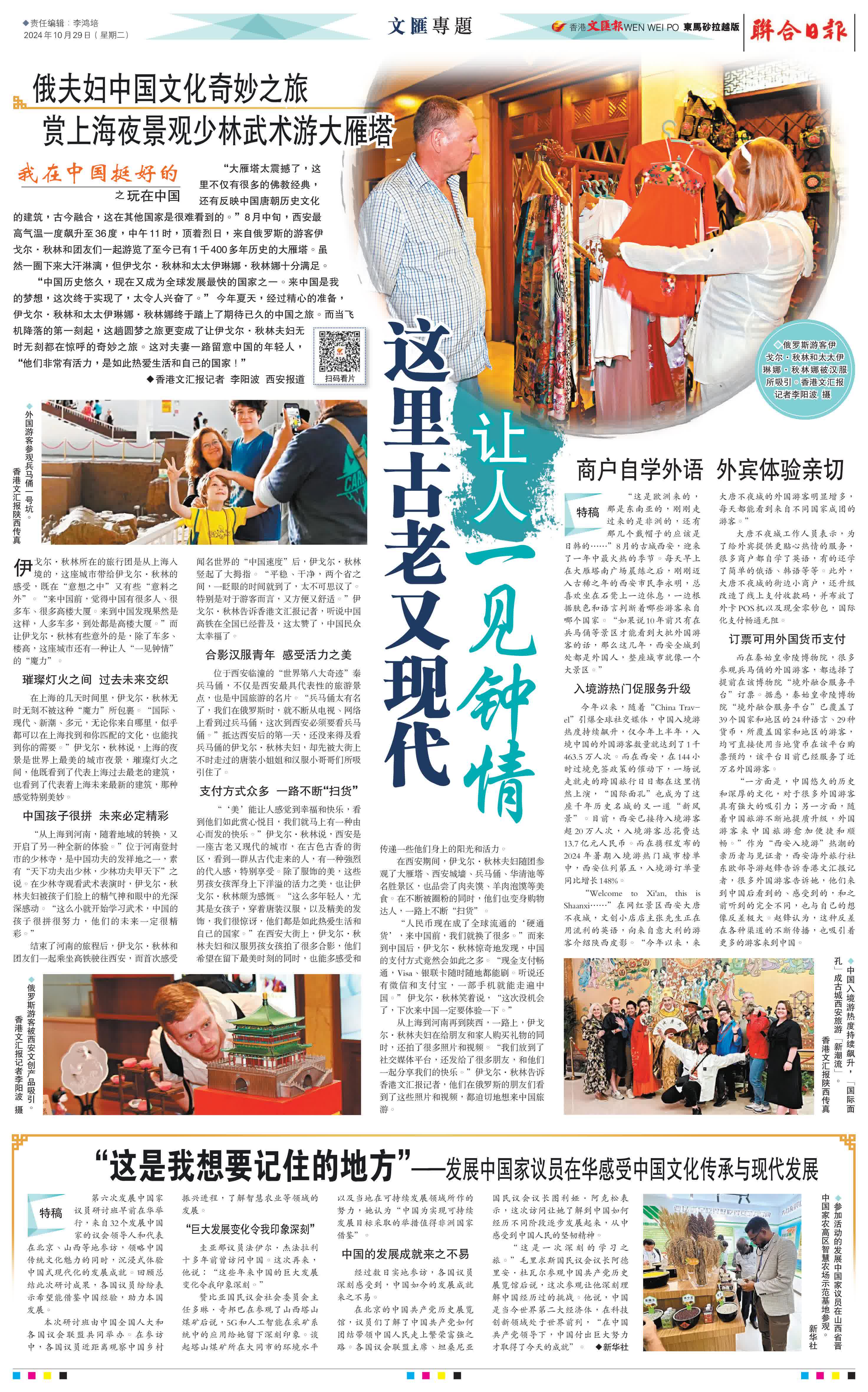 「大雁塔太震撼了,這裏不僅有很多的佛教經典,還有反映中國唐朝歷史文化的建築,古今融合,這在其他國家是很難看到的。」10月29日,《京華中原》《光華日報》《聯合日報》等多家海外華媒關注來自俄羅斯的遊客伊戈爾·秋林,他和團友們從上海到河南再到陝西,在8月中旬,頂着烈日,一起遊覽了至今已有1,400多年歷史的大雁塔。同時對他們對這幾個城市的歷史和未來、中國孩子、漢服、支付方式的看法等內容進行了報道。