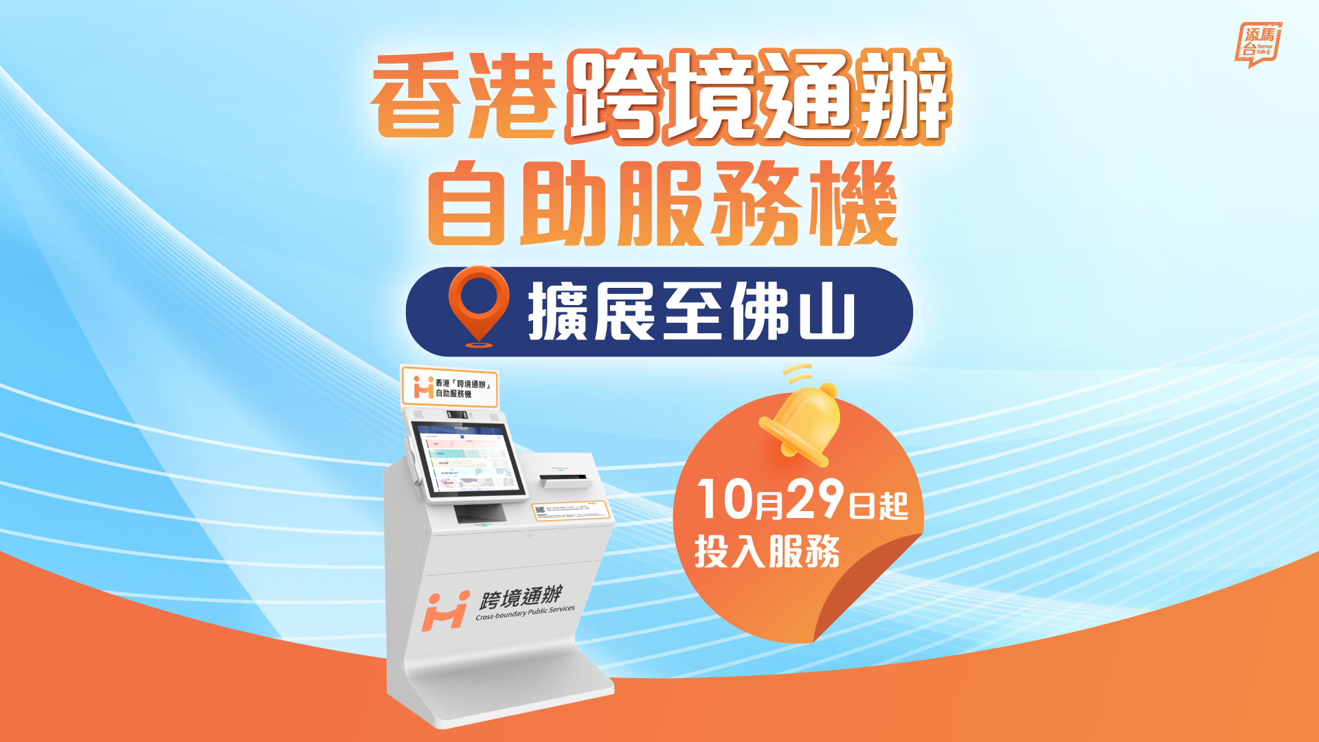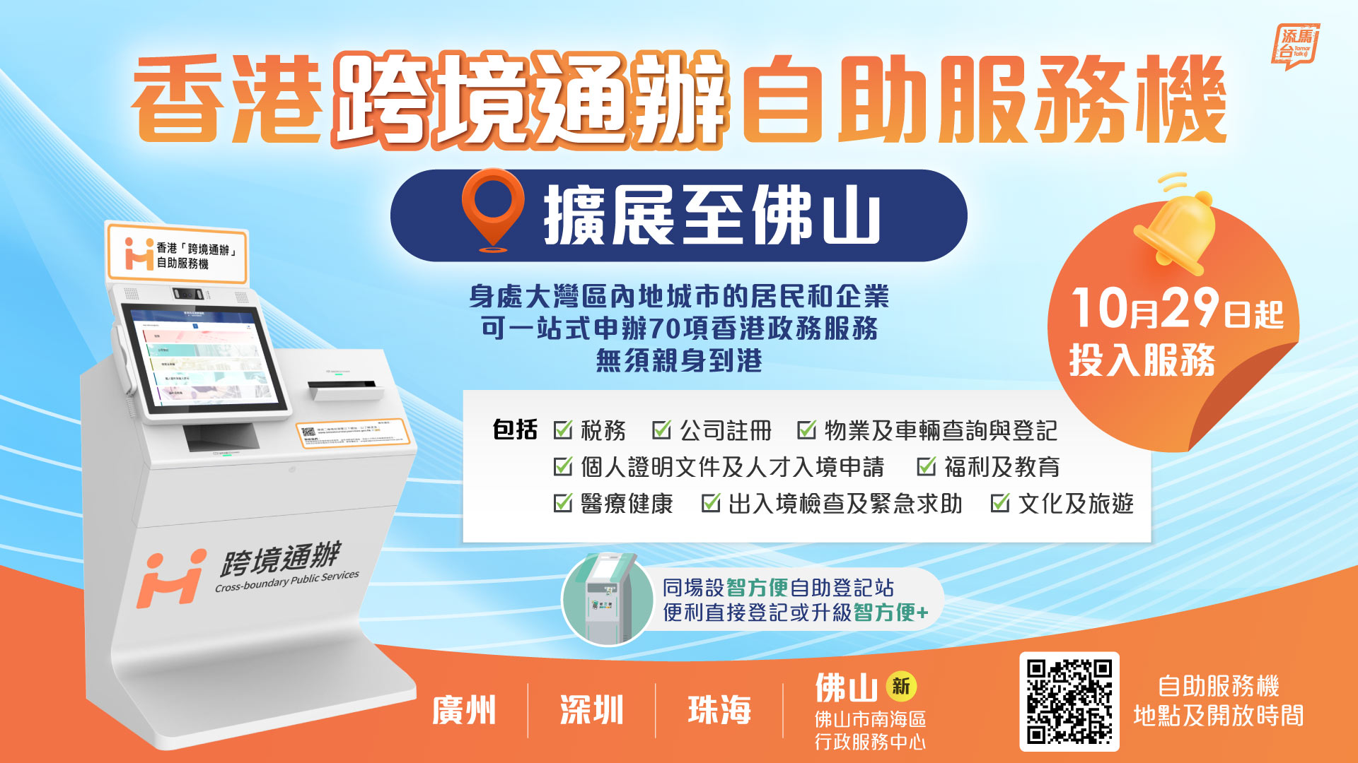 由今日(10月29日)起,身處大灣區內地城市的居民和企業,可使用設置於佛山的香港「跨境通辦」自助服務機,申辦70項香港政務服務,無須親身到港。看圖了解更多。
