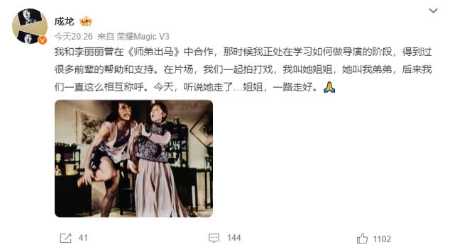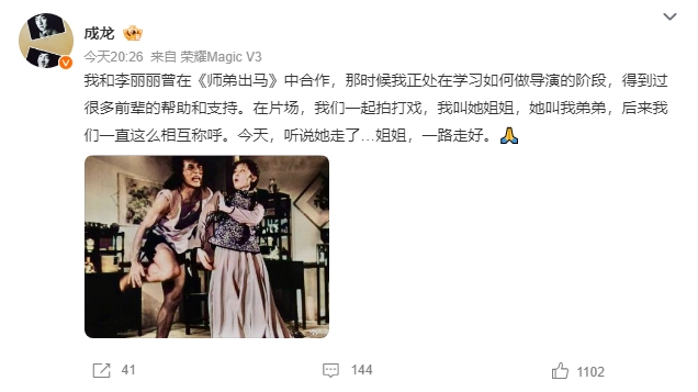 成龍表示,他和李麗麗曾在《師弟出馬》中合作,那時候他正處在學習如何做導演的階段,得到過很多前輩的幫助和支持。在片場,他們一起拍打戲,成龍叫她姐姐,她叫成龍弟弟,後來他們一直這麼相互稱呼。「今天,聽說她走了……姐姐,一路走好。」