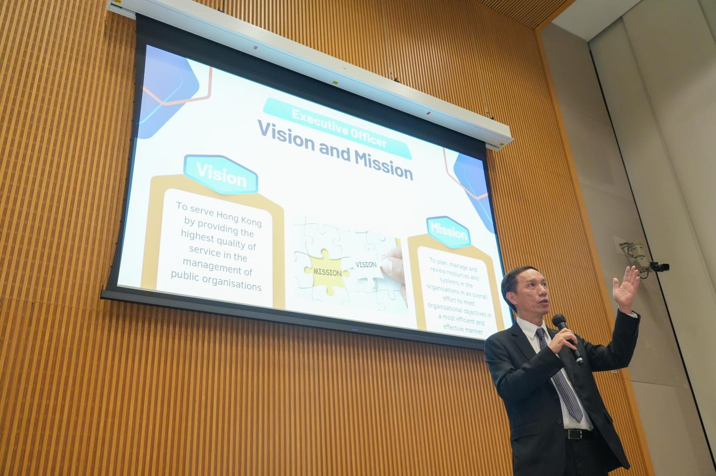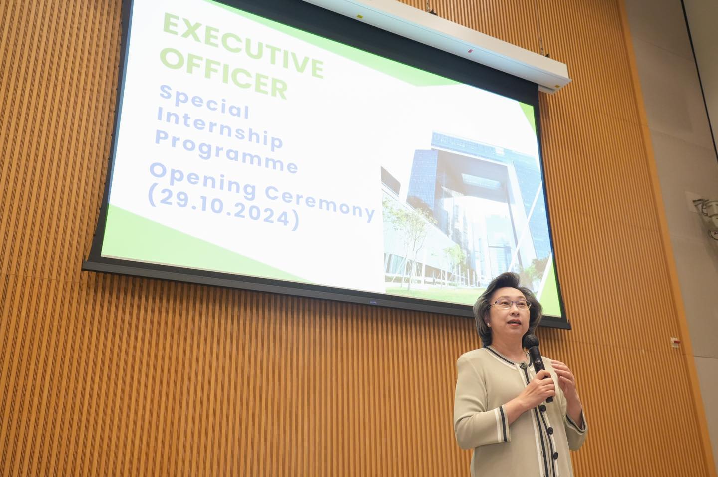 楊何蓓茵介紹,首屆EO職前實習計劃為期約半年,有兩大特色,包括一般職系處聯同10多個決策局和部門,提供超過30個多元化的職前實習項目,實習生可以經驗不同的行政主任崗位和工作場景,了解行政主任不同範疇的工作;實習過程有資深同事帶領沒有工作經驗的同學,為他們提供適切的指導。準二級行政主任將會獲「一對一」配對一名資深行政主任同事作為導師,另有負責實習項目的主管提供工作指引及支援。