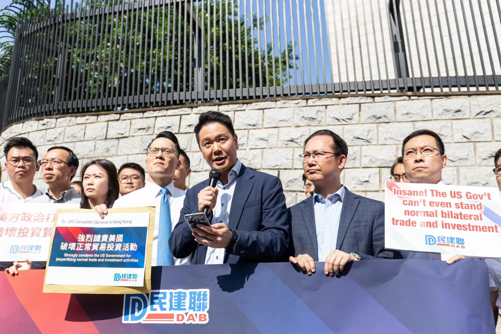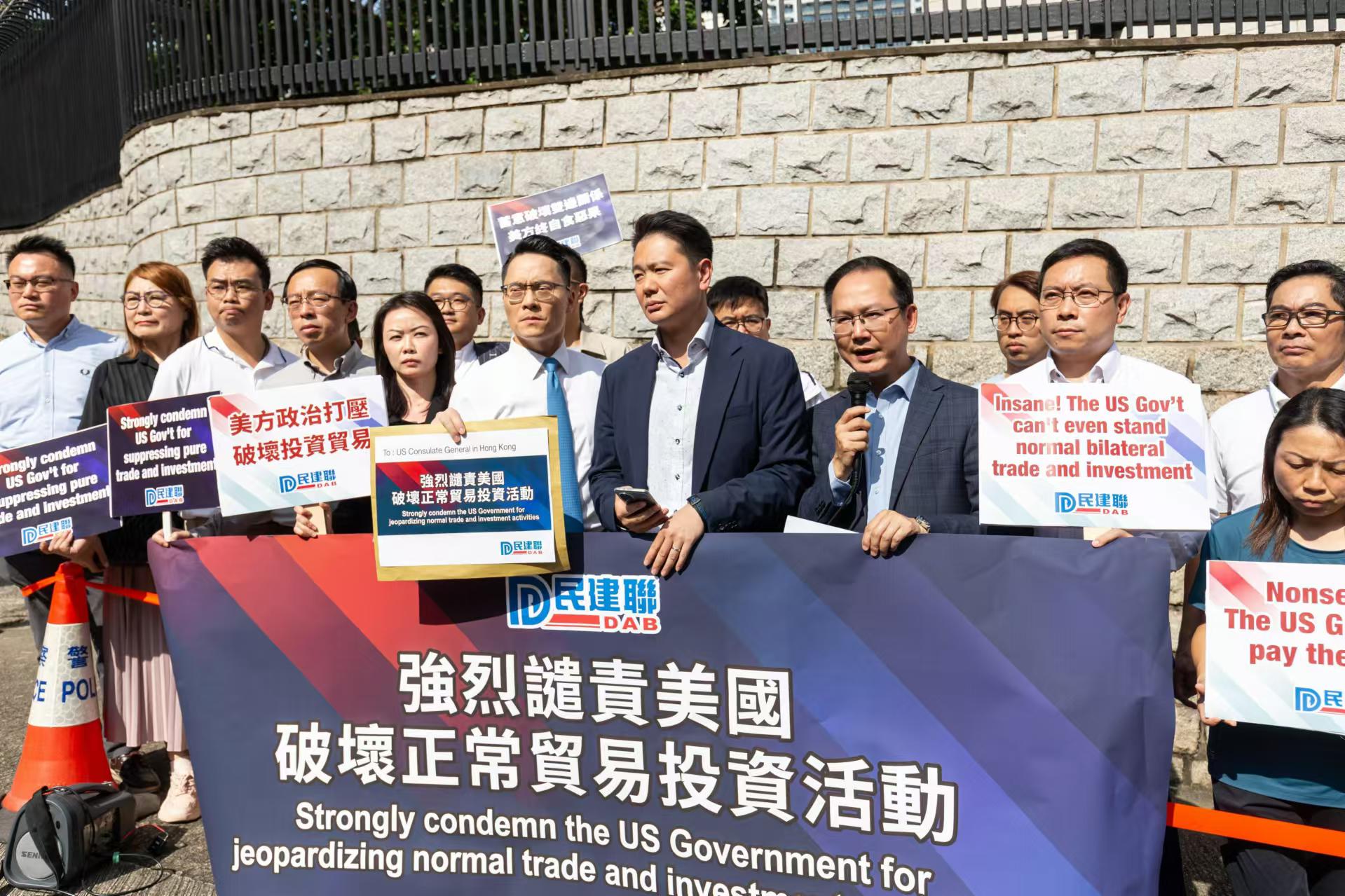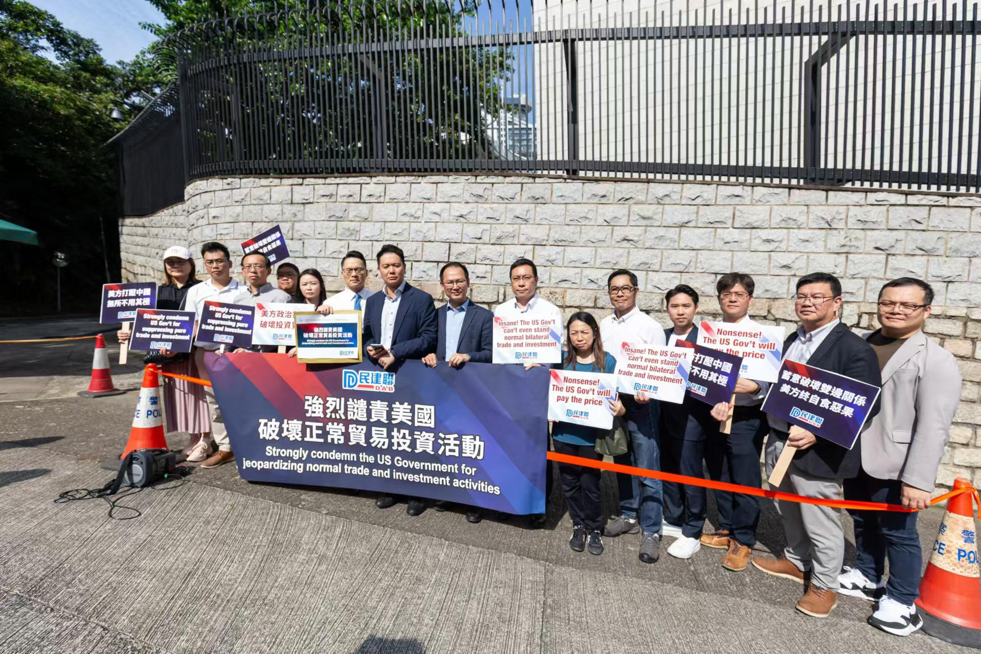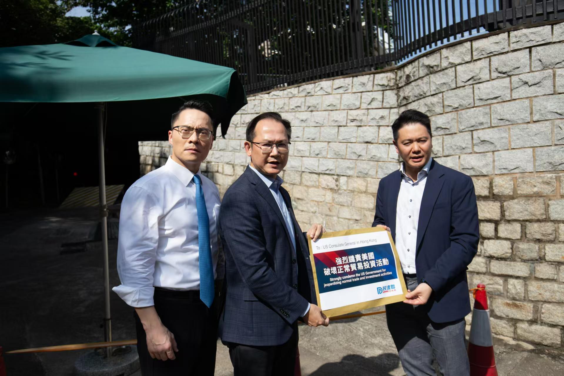 大公文匯全媒體報道,民建聯立法會議員周浩鼎、陳學鋒、梁熙,民建聯副秘書長葉文斌率領民建聯區議員,今日(30日)下午到美國駐港澳總領事館請願,強烈譴責美國為求自身政治利益,破壞正常投資貿易、自由市場和經濟秩序,限制資金投資在中國包括香港特區的投資半導體和微電子、量子信息技術,以及人工智能系統的領域。