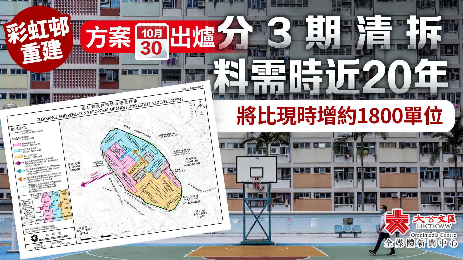 大公文匯全媒體報道,有消息指,於上世紀60年代落成入伙、平均樓齡達60年的彩虹邨,其重建方案將於今日(30日)內公布。彩虹邨的11棟樓將分3個階段進行清拆,第一期計劃最快於2028年展開,並預計於2039年完成清拆,目標是在2043年完成重建。