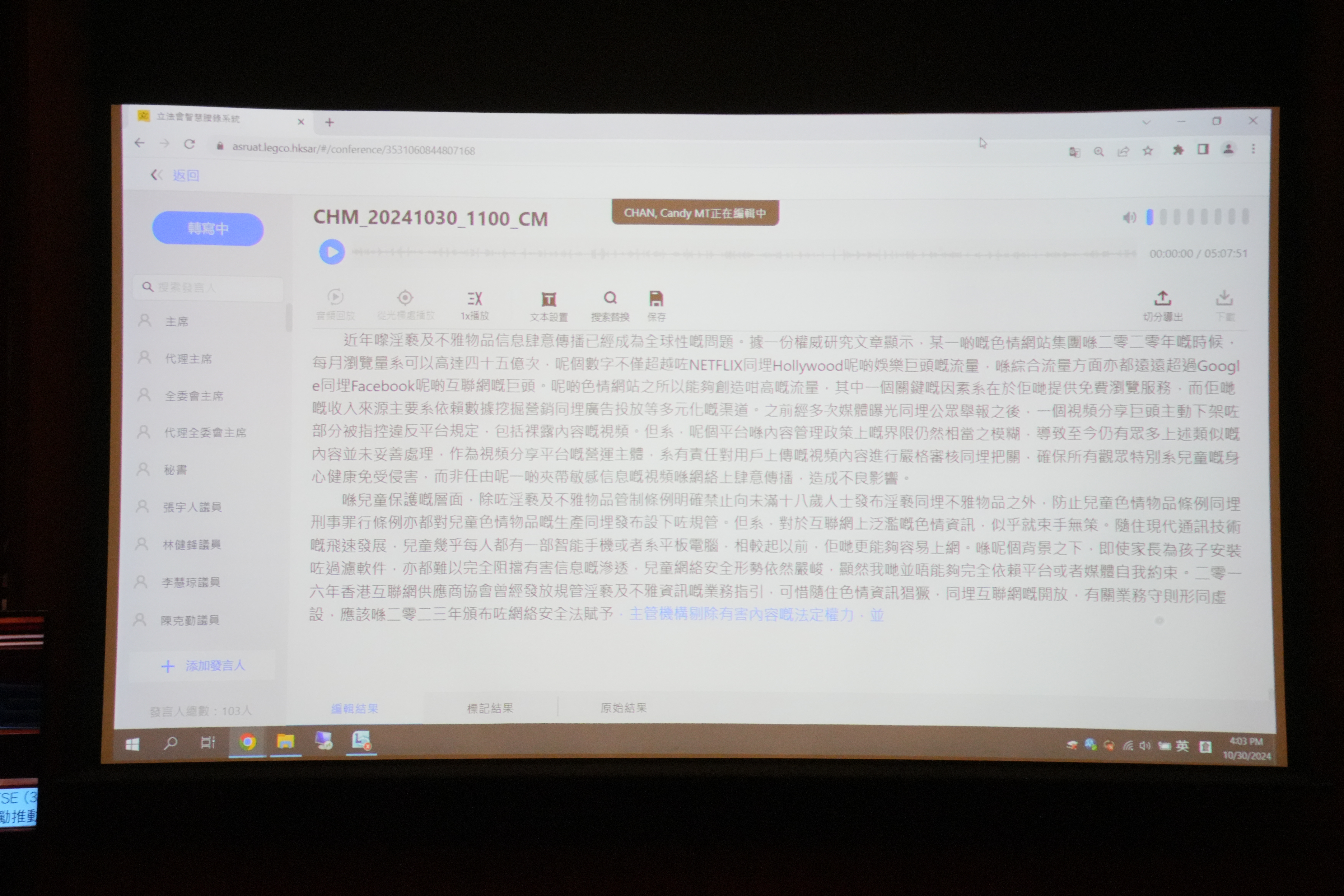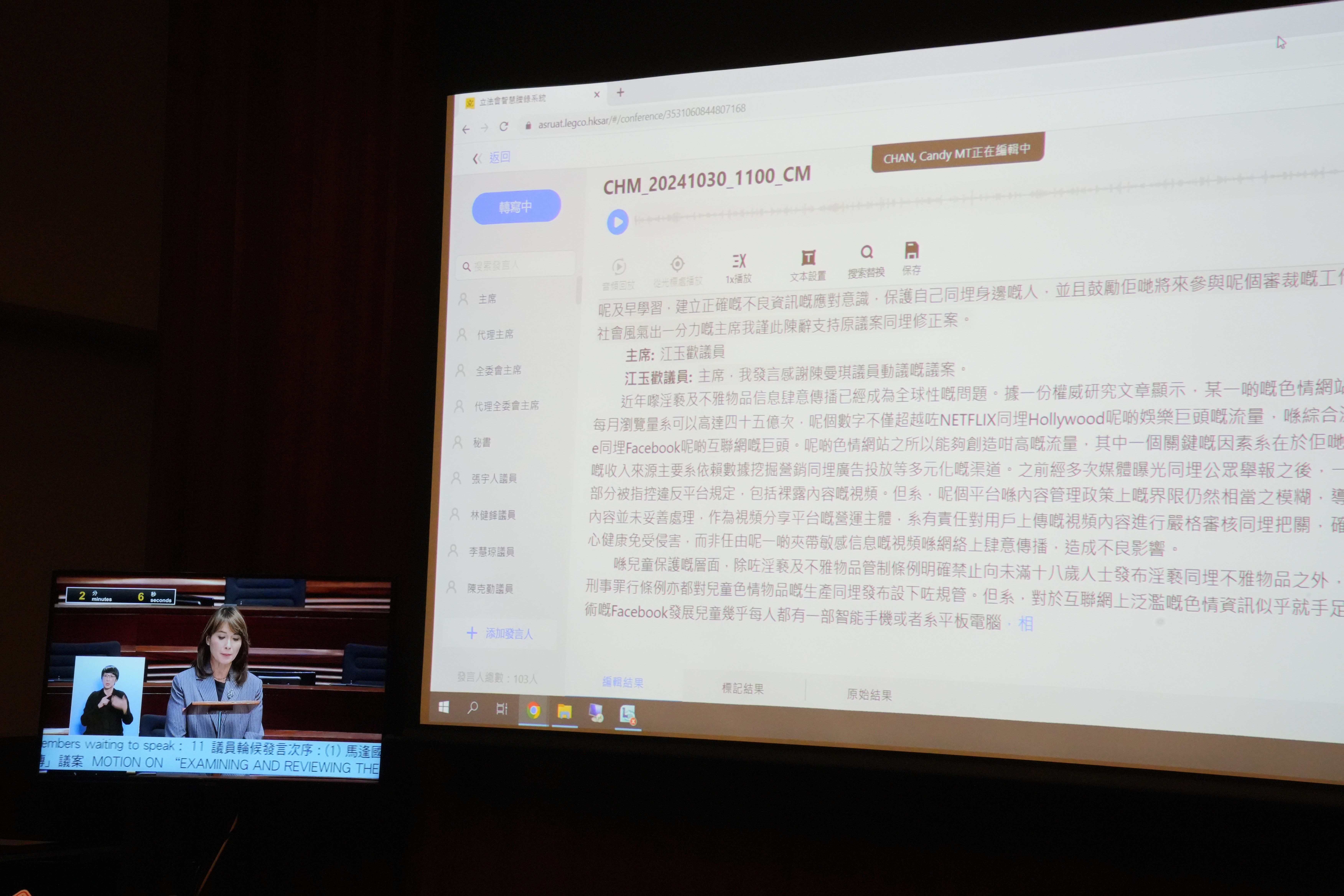 展示期間,會議紀錄不時顯示李世榮發言,並很快更正。梁君彥笑稱,「可能部機喜歡李世榮」。秘書處補充指,系統的聲紋辨別率達到70%,議員發言期間會有停頓,系統會錯以為是另一位議員發言,但普遍都能即時自動修正。