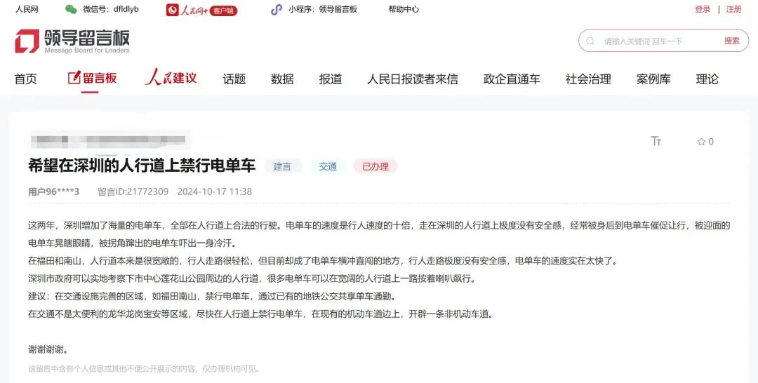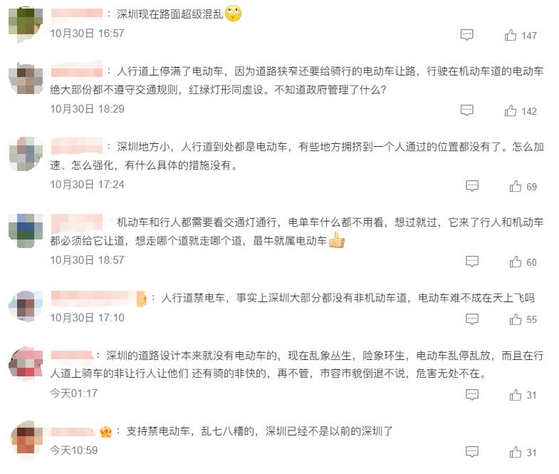 據南方都市報報道,今年以來,深圳市民陸續反映,希望在規劃出獨立的非機動車道之前,能夠讓電動單車從深圳的人行道上下來,禁止電動單車在深圳的人行道上騎行;在機動車道旁規劃出一條非機動車道,這樣能夠保護深圳行人在人行道上走路的最基本路權,也能讓非機動車走得更通暢。