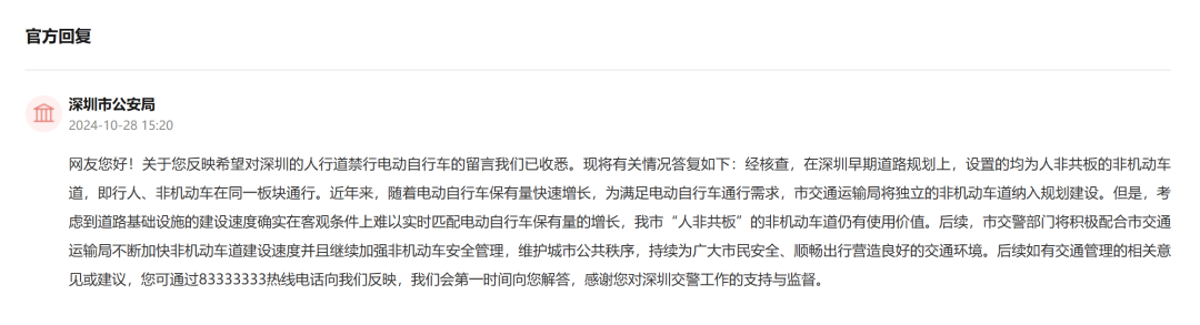 據深圳市公安局反饋,後續,市交警部門將積極配合市交通運輸局不斷加快非機動車道建設速度並且繼續加強非機動車安全管理,維護城市公共秩序,持續為廣大市民安全、順暢出行營造良好的交通環境。該局也表示,後續如有交通管理的相關意見或建議,市民可通過83333333熱線電話反映。