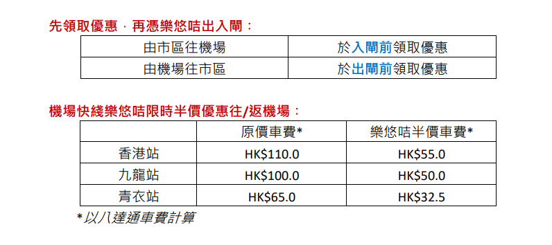 樂悠咭持有人只需於出入閘前,前往機場快綫客務中心(博覽館站除外)出示樂悠咭,即可領取八達通車費半價優惠,再憑咭以優惠價乘搭機場快綫由香港站、九龍站或青衣站往返機場。另外,享用此優惠的樂悠咭持有人,仍可享機場快綫免費港鐵接駁服務,由任何港鐵站往返香港站、九龍站或青衣站的港鐵接駁車程均免費。