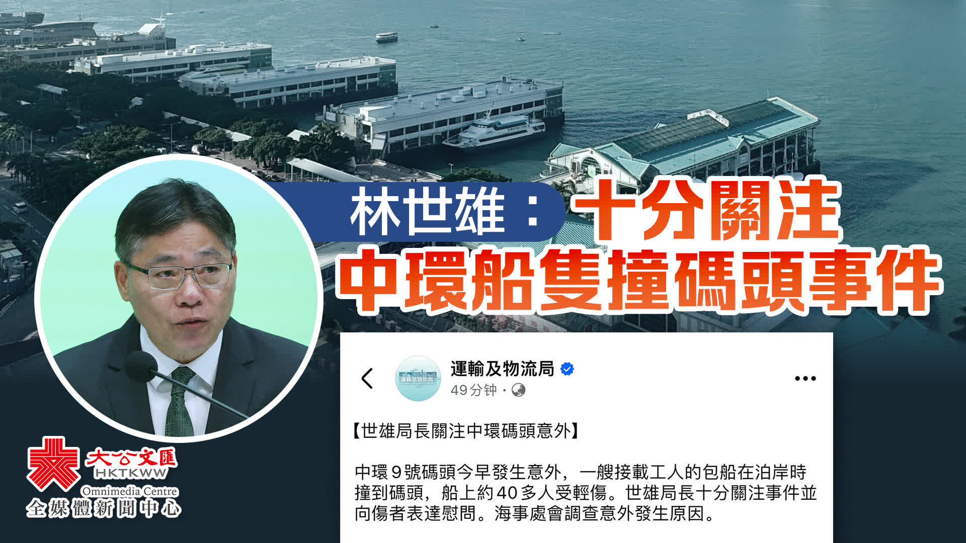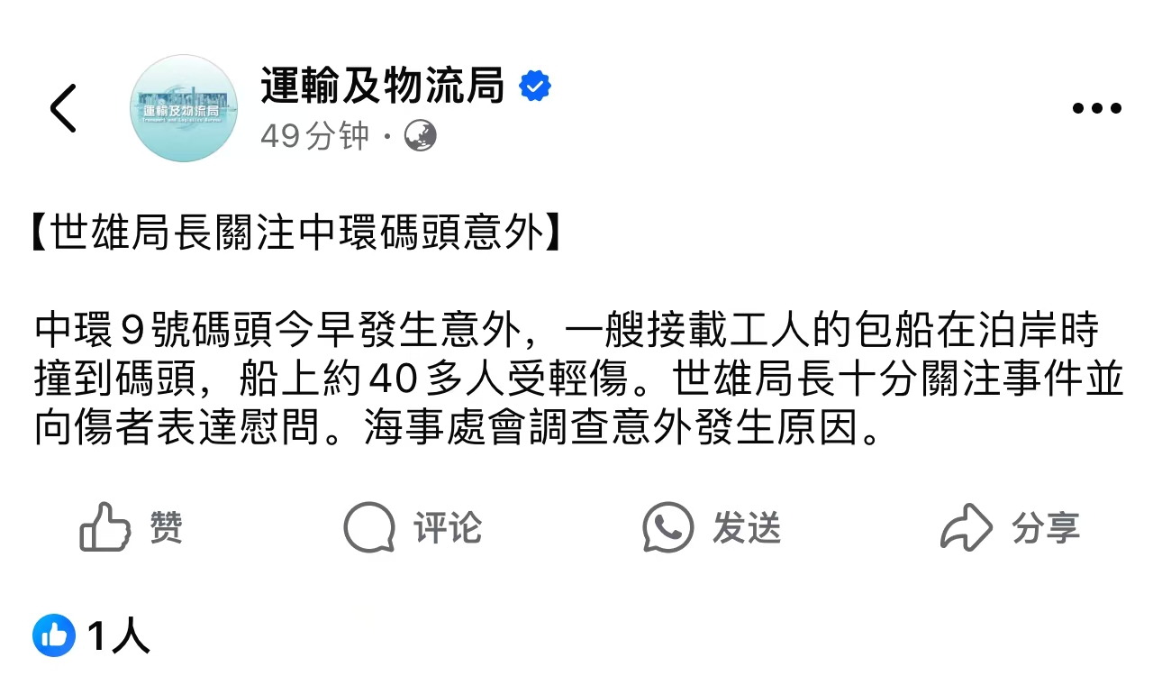 大公文匯全媒體報道,運輸及物流局局長林世雄今日(11月1日)於社交網頁表示,十分關注中環9號碼頭早上的船隻撞到碼頭事件,並向傷者表達慰問,海事處會調查意外原因。
