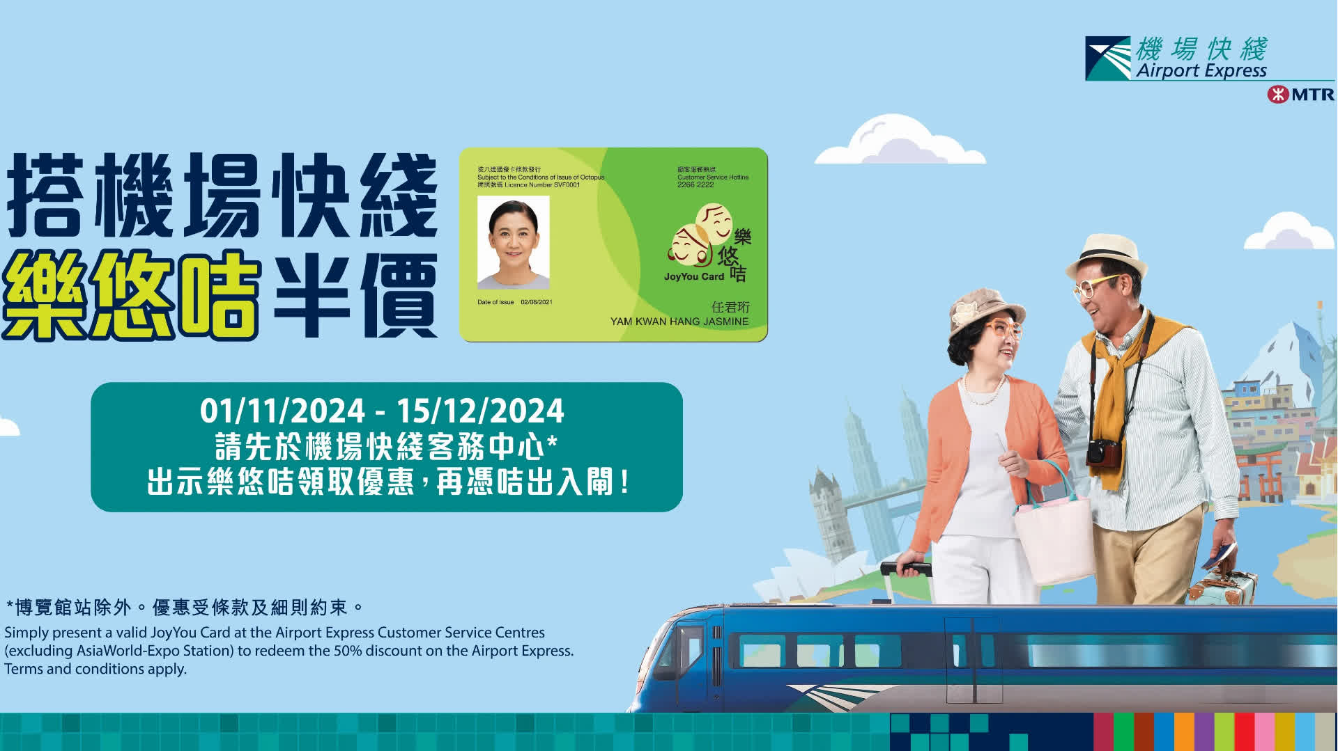 大公文匯全媒體報道,機場快綫由今日(11月1日)起至12月15日推出「樂悠咭半價優惠」,以香港站為例,車費原價為110元,半價後即55元!值得一提的是,樂悠咭持有人同時可享機場快綫免費港鐵接駁服務,由任何港鐵站往返香港站、九龍站或青衣站的港鐵接駁車程均免費。