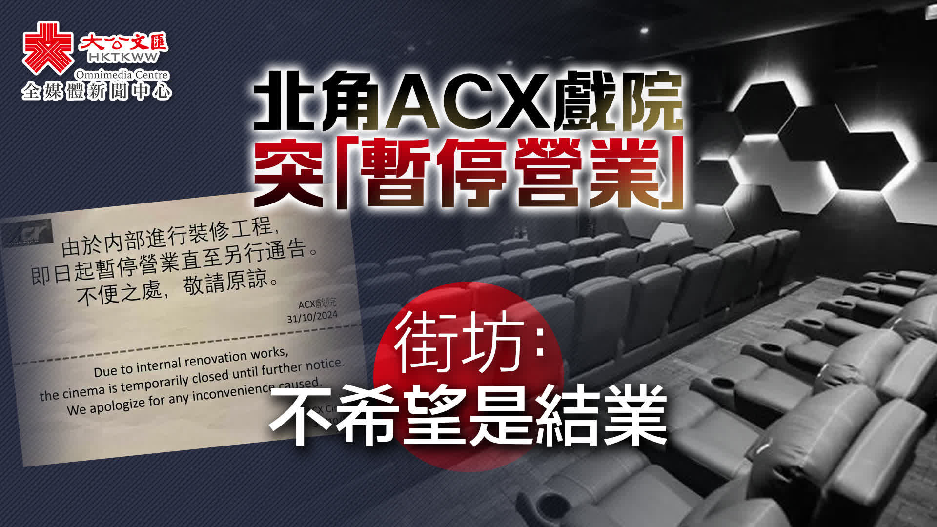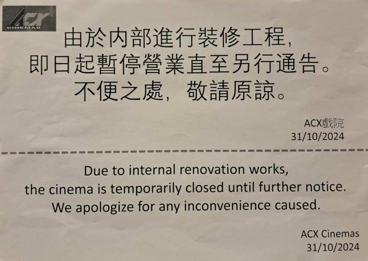 大公文匯全媒體報道,位於北角匯的ACX戲院昨日(10月31日)在其Facebook官方專頁突發帖,帖文上傳的通告照片寫道:「由於內部進行裝修工程,即日起暫停營業直至另行通告」,並向一眾街坊表示「不便之處,敬請原諒」。點新聞記者瀏覽ACX戲院的官網,發現目前已經沒有預售或即將上映的電影場次。