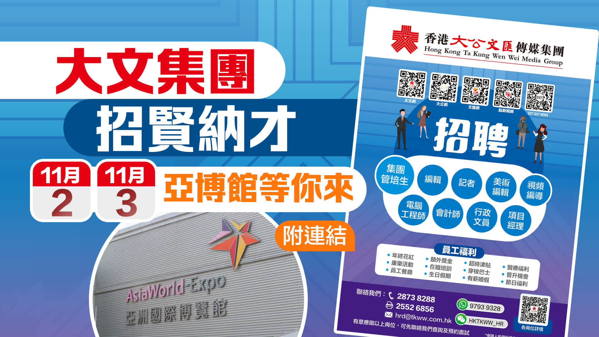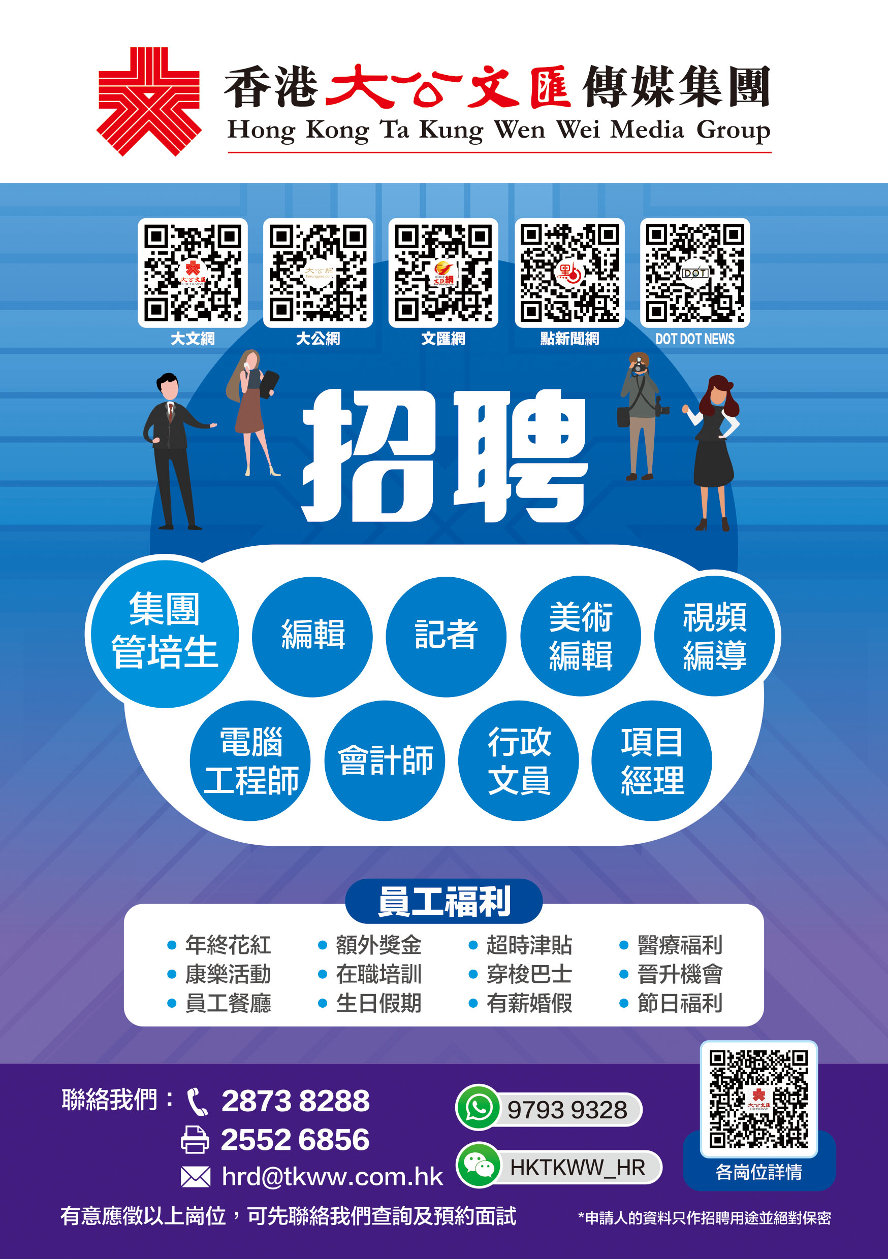 香港大公文匯傳媒集團誠聘集團管培生、採編崗位、行政崗位及經營崗位人員(工作地點均在香港)。有意申請這些崗位人士,請將中英文履歷電郵至:hrd@tkww.com.hk,或郵寄至:香港香港仔田灣海旁道七號興偉中心3樓,香港大公文匯傳媒集團人力資源部收。請註明應聘職位,合則約見(申請人所提供的資料將予以保密及只作招聘有關職位用途)。