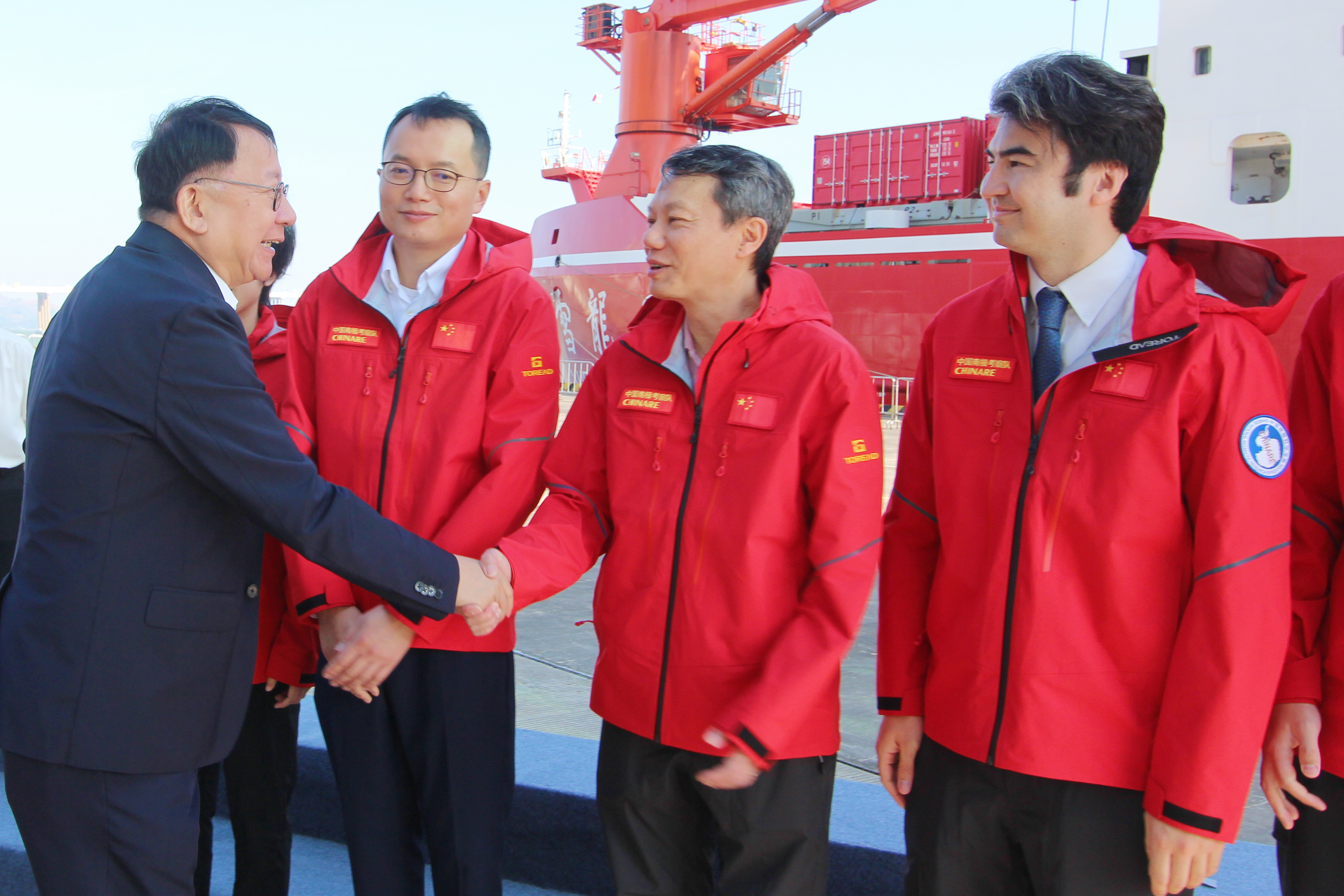 歡送儀式中,孫書賢向包括香港科學家在內的第41次南極考察隊授予出征的旗幟。香港科學家代表、中大地球與環境科學系周達誠教授感到非常興奮,他表示:「到南極做科研考察,是許多地球及環境學者的夢想。今次國家支持中大團隊到南極做實驗,是對香港及中大的肯定,也是香港科研的重要里程碑。我們很榮幸成為首批參與南極實地考察的香港科學家,為日後的科研人員奠下基礎。」