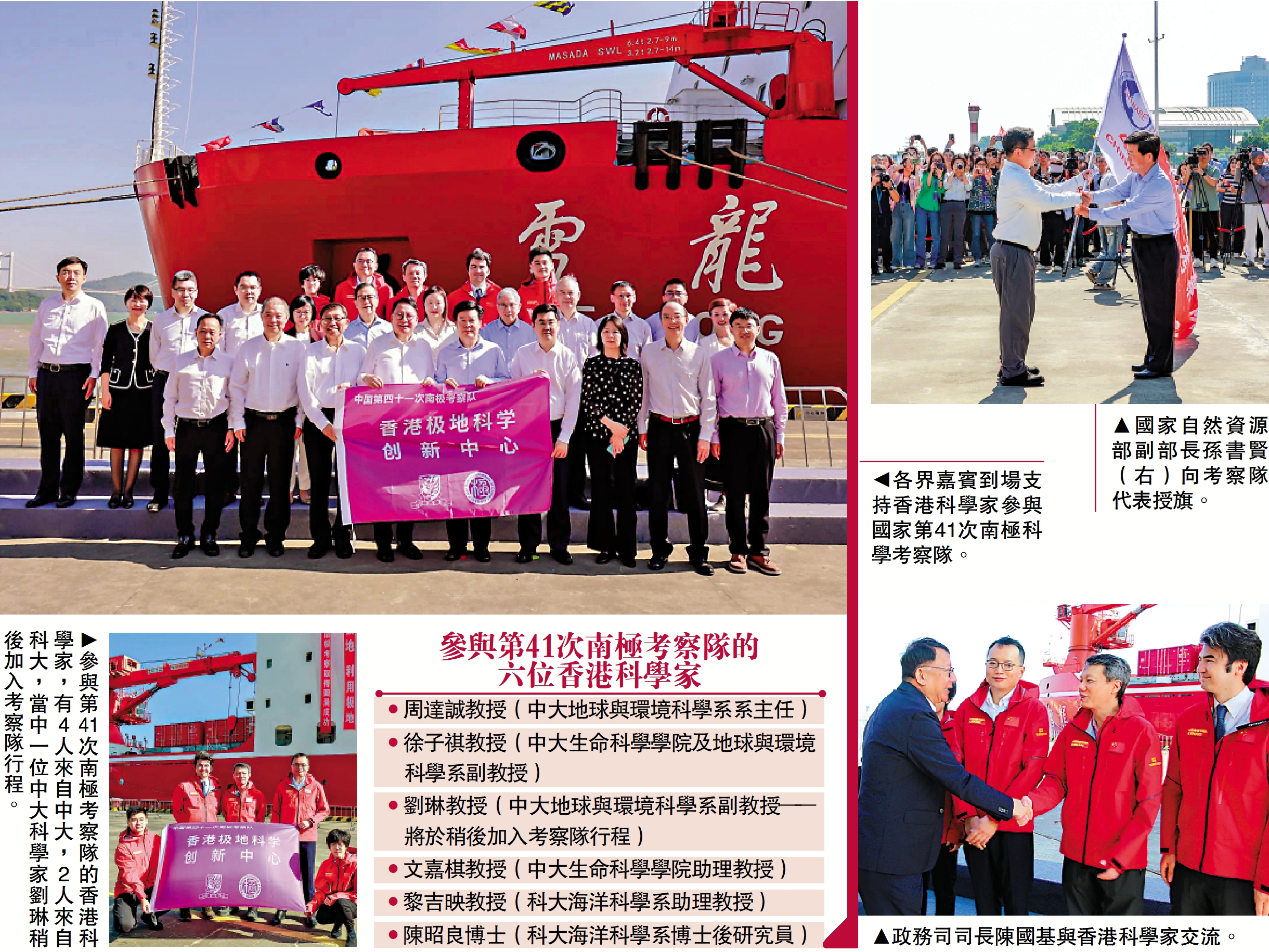 六位將參與第41次南極考察隊的香港科學家有四人來自香港中文大學(中大),兩人來自香港科技大學(科大)。中大與中國極地研究中心今年8月簽署戰略合作框架協定,建立長期合作夥伴關係,共同建立香港極地科學創新中心。中大在廣州南沙參與由自然資源部及廣東省人民政府共同舉辦的中國第41次南極科學考察啟航活動,並組織香港科學家參與考察隊的出征歡送儀式。