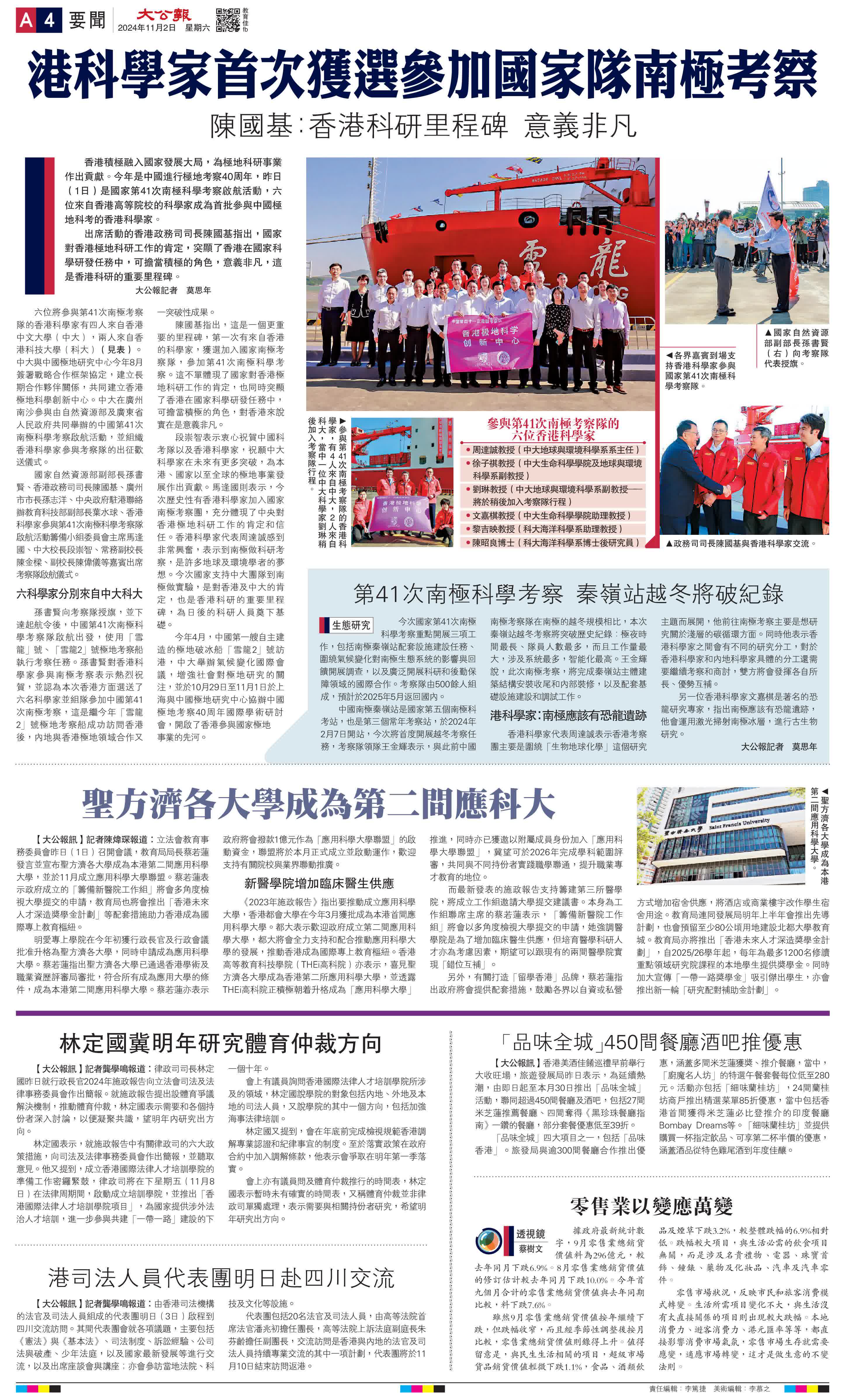 (大公報記者 莫思年)香港積極融入國家發展大局,為極地科研事業作出貢獻。今年是中國進行極地考察40周年,昨日(1日)是國家第41次南極科學考察啟航活動,六位來自香港高等院校的科學家成為首批參與中國極地科考的香港科學家。