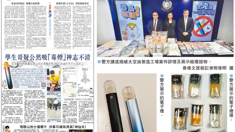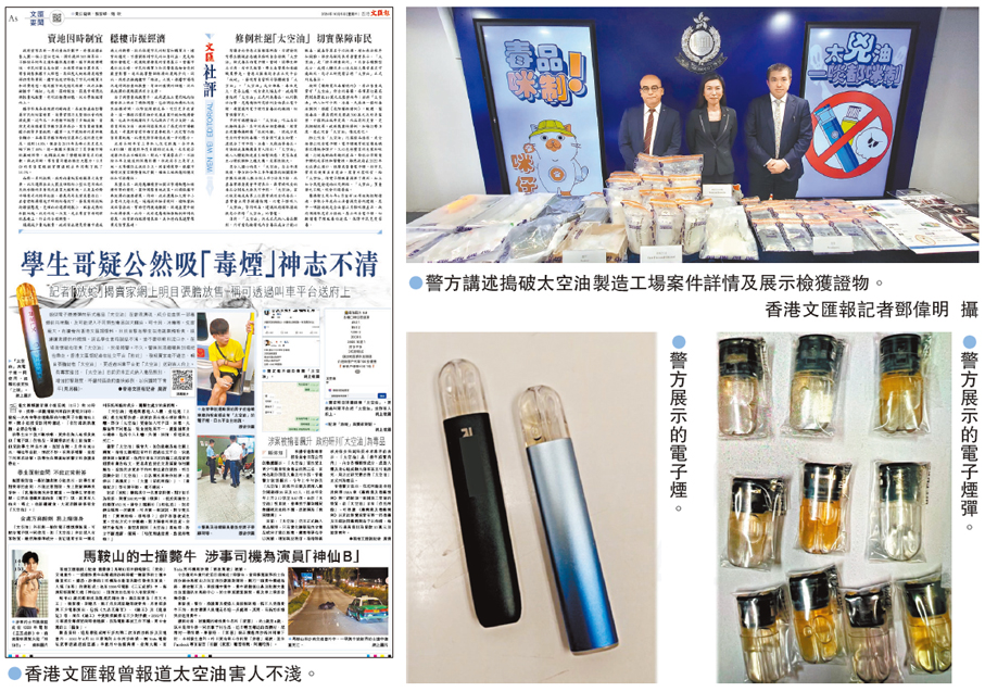 (香港文匯報 記者 蕭景源)俗稱「太空油」的依托咪酯,被不法分子加工成液態,混入電子煙彈販售,並巧立名目特別向青少年販售,損害吸食者健康及成癮。有關案件由2023年中起呈上升趨勢,今年截至9月30日共有60宗涉及依托咪酯案及拘捕98人,其中16人為21歲以下,目前至少有3宗疑因太空油導致的死亡病例,成為奪命「太兇油」。警方毒品調查科日前首次針對製油源頭展開打擊行動,在長沙灣一工廈單位拘捕一名青年,並在單位內檢獲約1.3公斤依托咪酯、200毫升液體依托咪酯、362個載有液體依托咪酯的電子煙彈、加工工具等。