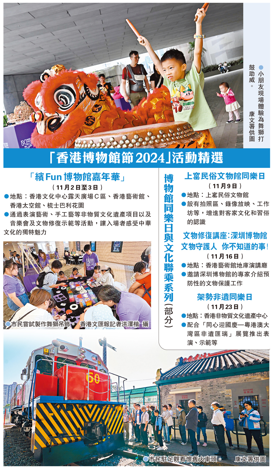 (香港文匯報 記者 洪澤楷)由香港特區政府康樂及文化事務署舉辦的「香港博物館節2024」本月期間,將在轄下17間博物館及文化空間合共推出70多項精彩節目,打頭陣「繽Fun博物館嘉年華」於昨日啟動,一連兩日在尖沙咀文化中心露天廣場、香港藝術館、香港太空館、梳士巴利花園舉行。現場設有多個攤位,市民可親身與舞獅互動,體驗非遺手工藝花鈕製作,欣賞木偶戲表演。今日下午四時至六時,擁有上百年歷史的舞火龍亦會衝出薄扶林,到尖沙咀巡遊表演。署方預料,今年博物館節將吸引約54萬人次參與,較去年多兩萬人次,大部分活動免費,市民可即場參與。