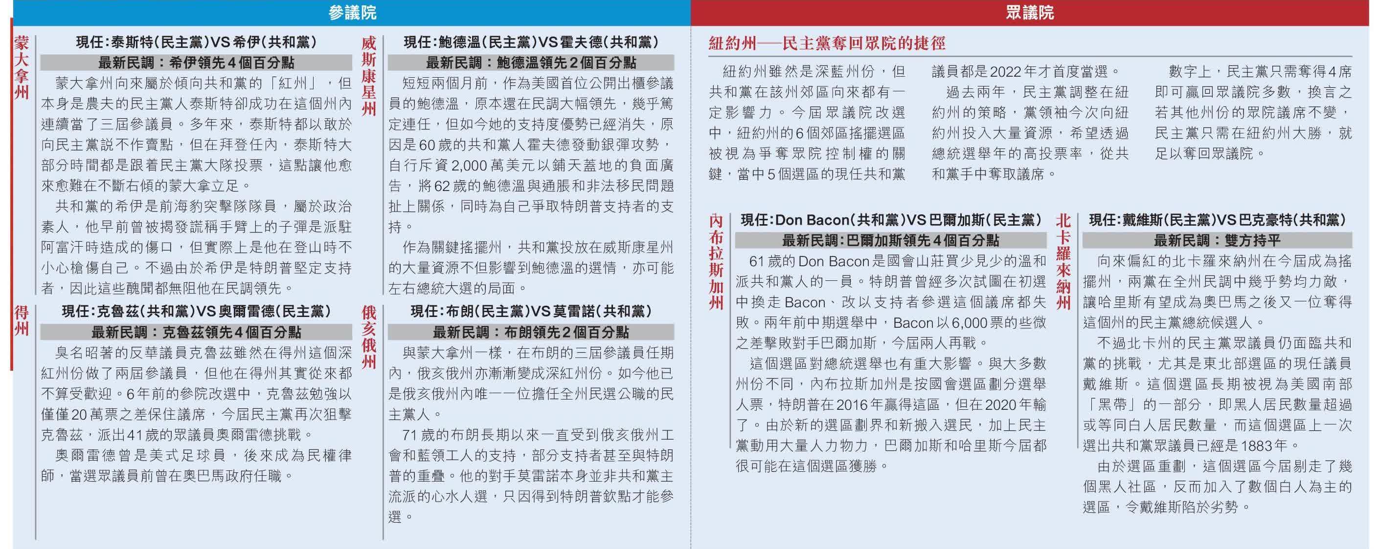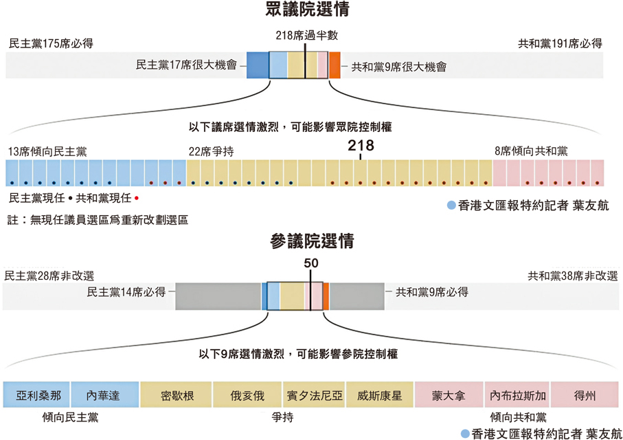 一如往屆選舉,今年美國國會眾議院也會改選全部議席,參議院則有三分之一(共34席)需要改選。按照當前民調,目前控制眾議院的共和黨距離眾議院過半數議席較接近,只需在選情較緊張的25個選區中取下11席即可;在參議院,民主黨需要改選的議席數較多,本身就已經較為不利,當中幾個需改選議席戰況激烈,甚至可以說,共和黨幾乎可以篤定從民主黨手中奪得參議院控制權。