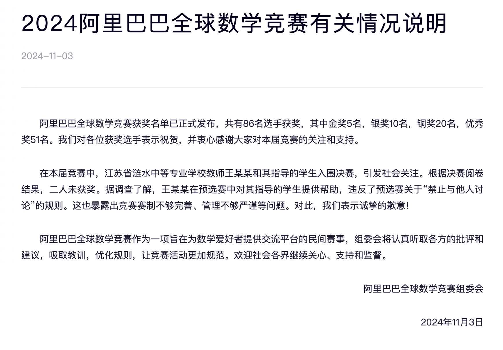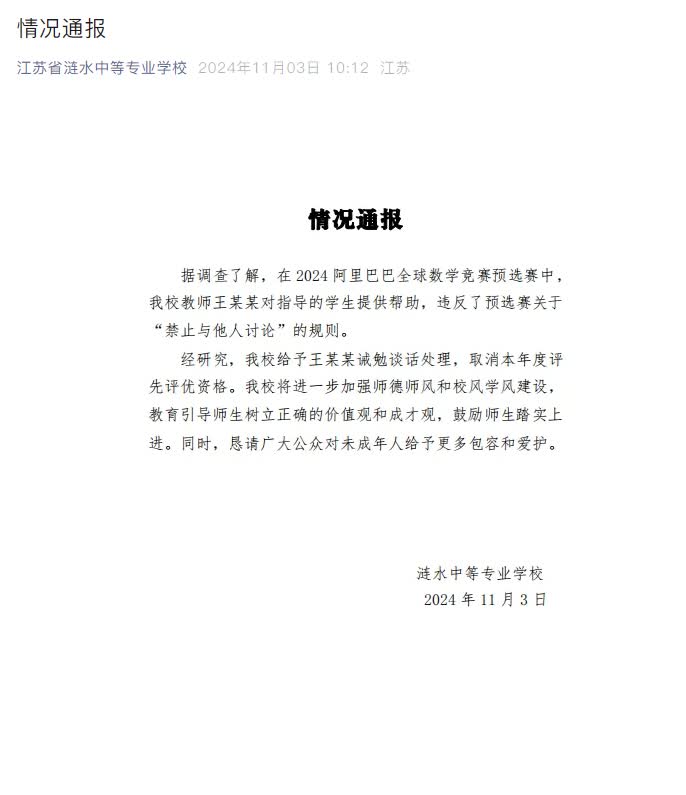 大公文匯網報道,江蘇省漣水中等專業學校今日(3日)一早發布情況通報:據調查了解,在2024阿里巴巴全球數學競賽預選賽中,我校教師王某某對指導的學生提供幫助,違反了預選賽關於「禁止與他人討論」的規則。經研究,我校給予王某某誡勉談話處理,取消本年度評先評優資格。我校將進一步加強師德師風和校風學風建設,教育引導師生樹立正確的價值觀和成才觀,鼓勵師生踏實上進。同時,懇請廣大公眾對未成年人給予更多包容和愛護。