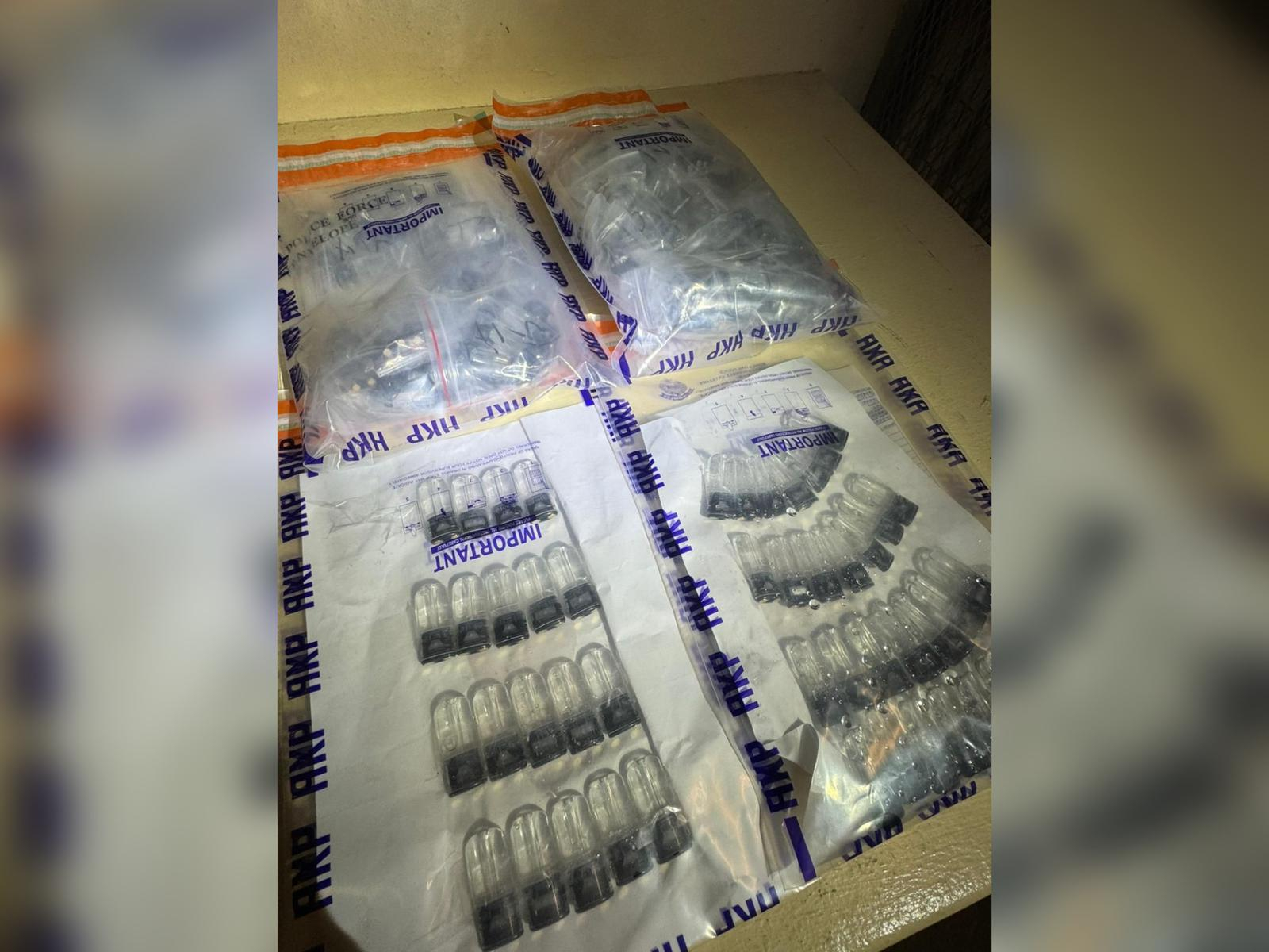 另外,人員同日於元朗公園南路一屋苑拘捕一名32歲本地男子及18歲本地女子,涉嫌管有第一部毒藥。人員亦扣查兩部屬於被捕人的房車,懷疑與案有關。初步調查顯示,該兩名被捕男女涉嫌安排上述兩名被捕男子,將依托咪酯粉末混入不同香味的甘油,加工後製成煙彈出售。所有被捕人現正被扣留調查。
