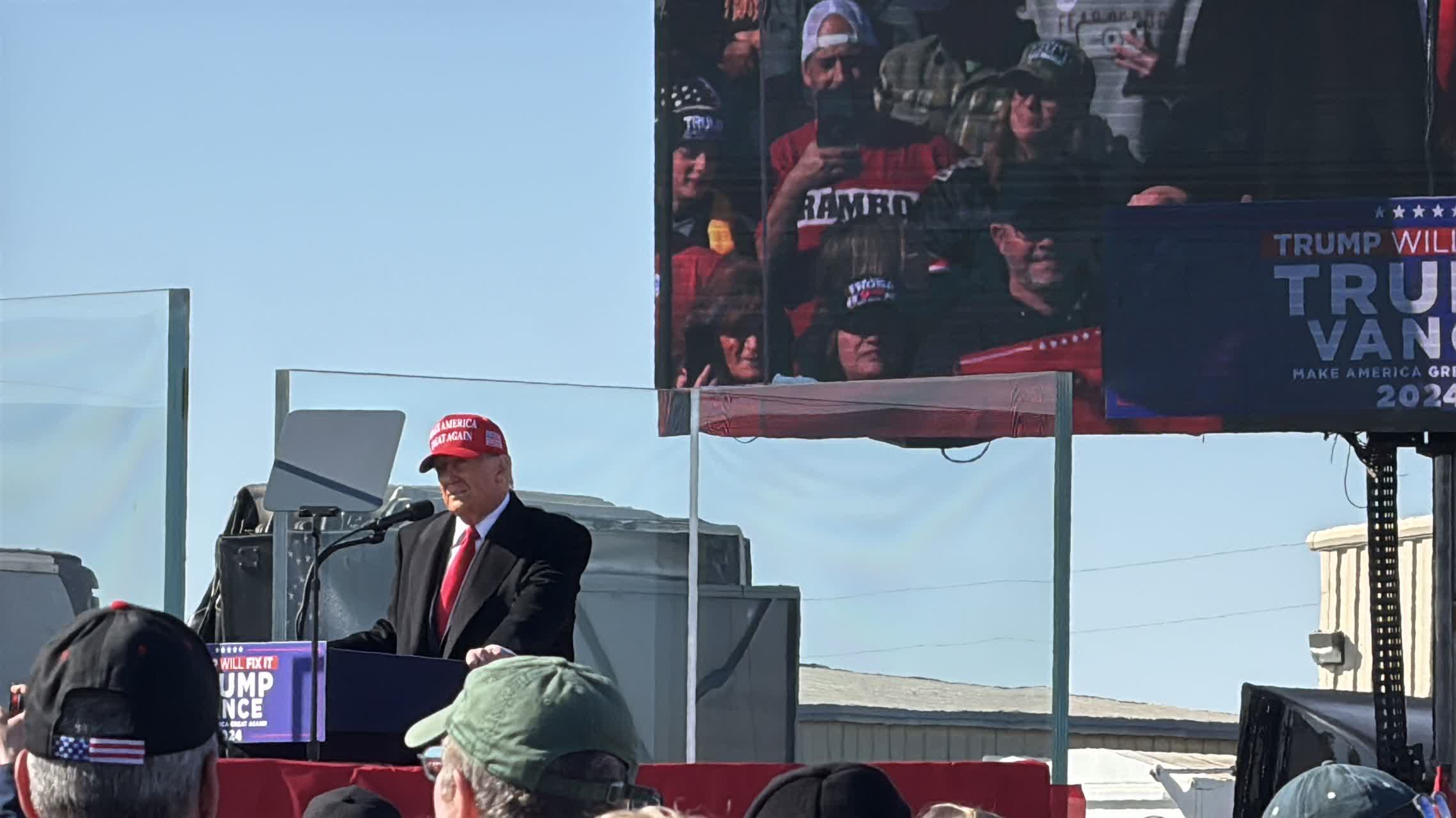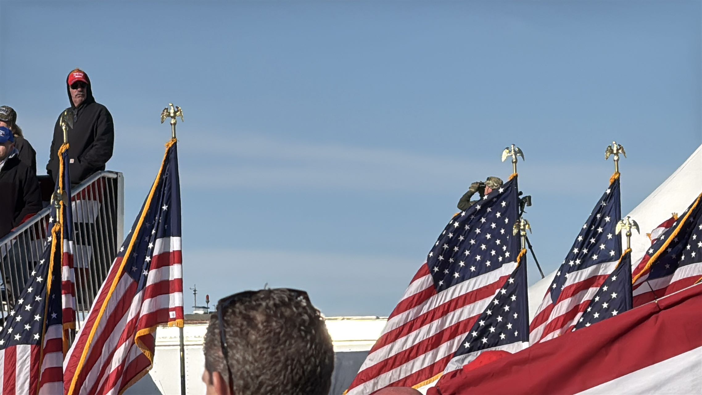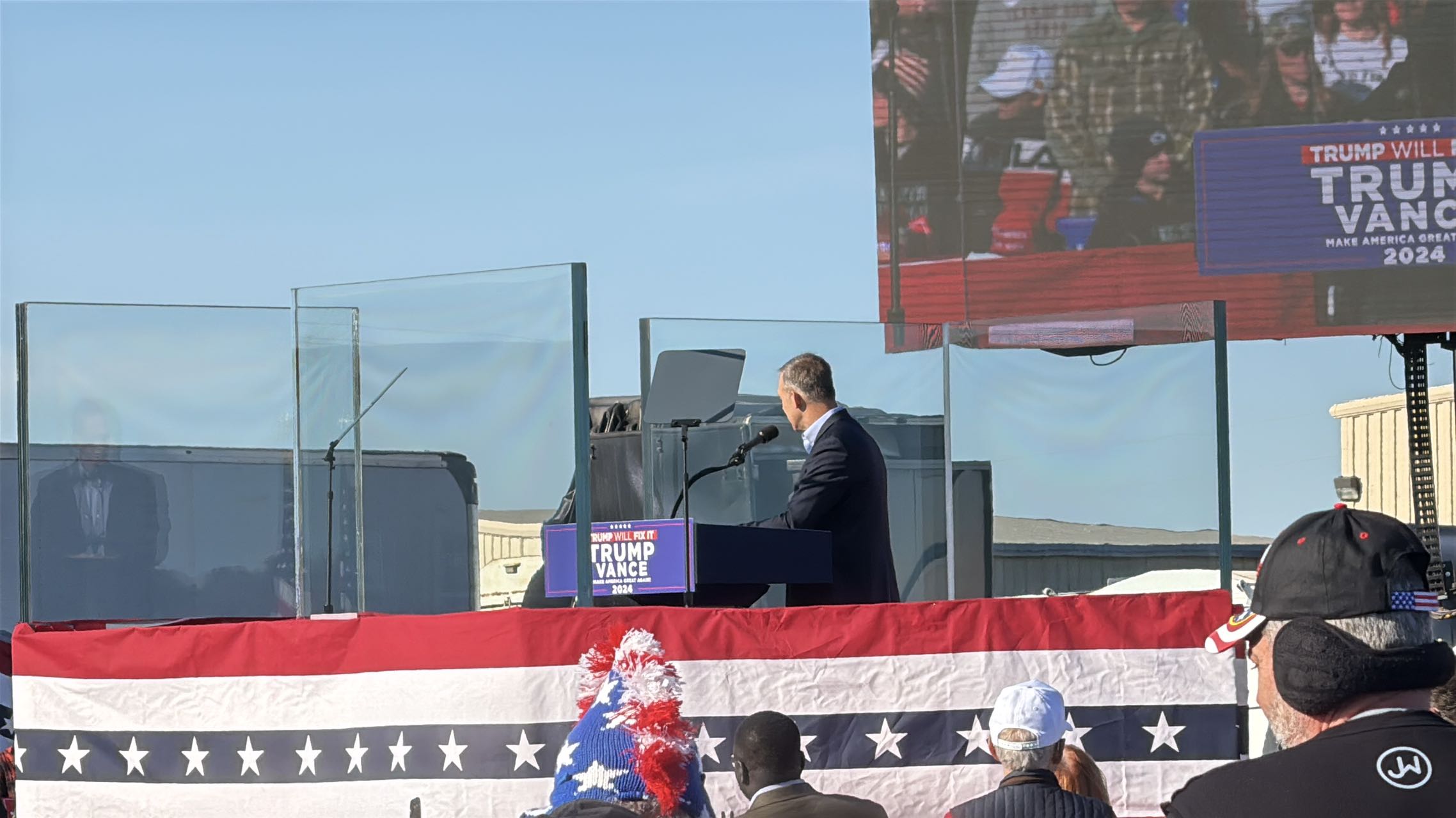 今日戶外露天集會現場,主演講台被厚厚的防彈玻璃圍住,四周屋頂亦都有嚴密戒備。今年7月,特朗普在賓州競選集會遇刺,耳朵中槍受傷,當時也是在戶外露天現場。