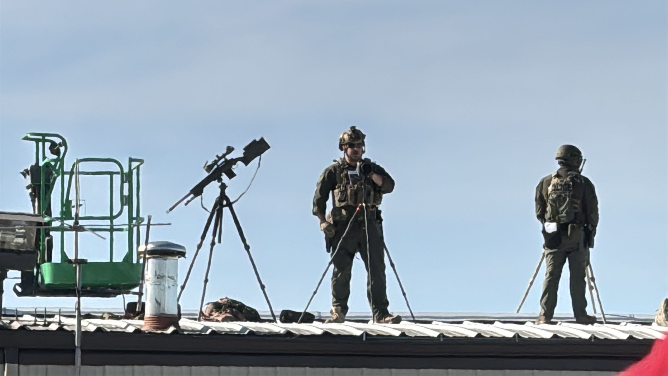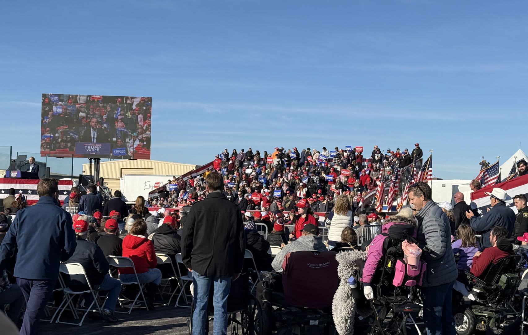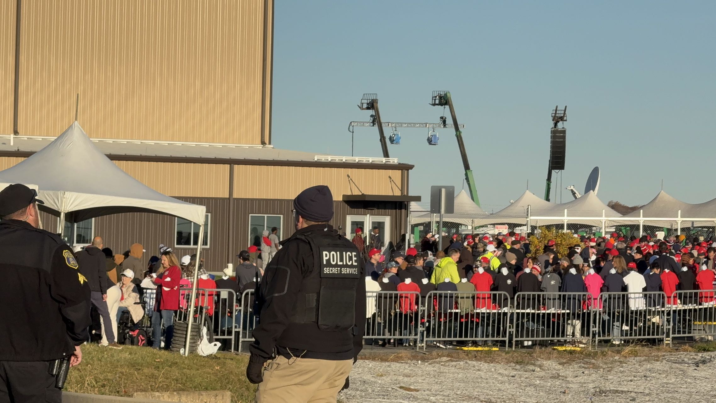 今日戶外露天集會現場,主演講台被厚厚的防彈玻璃圍住,四周屋頂亦都有嚴密戒備。今年7月,特朗普在賓州競選集會遇刺,耳朵中槍受傷,當時也是在戶外露天現場。