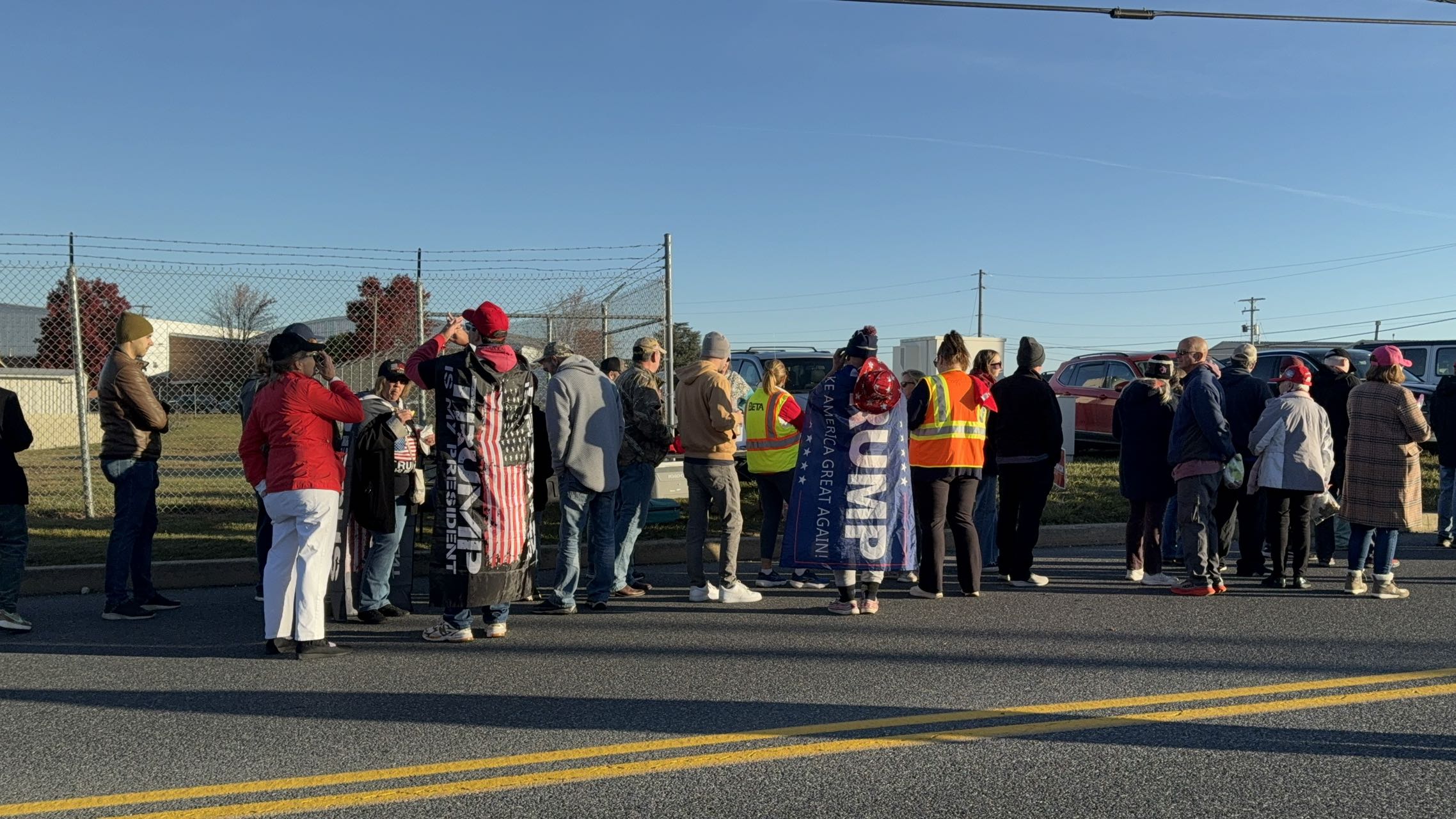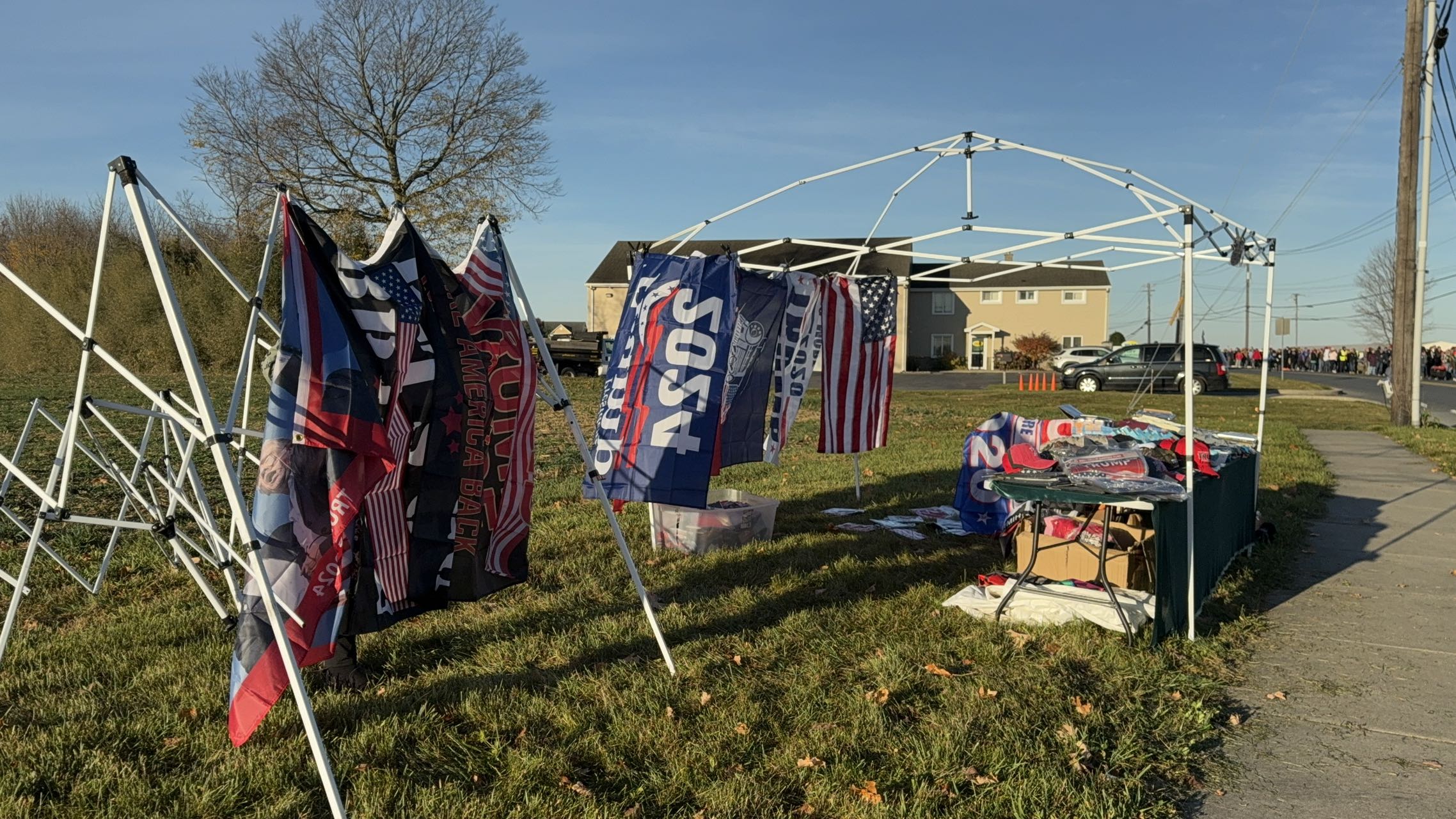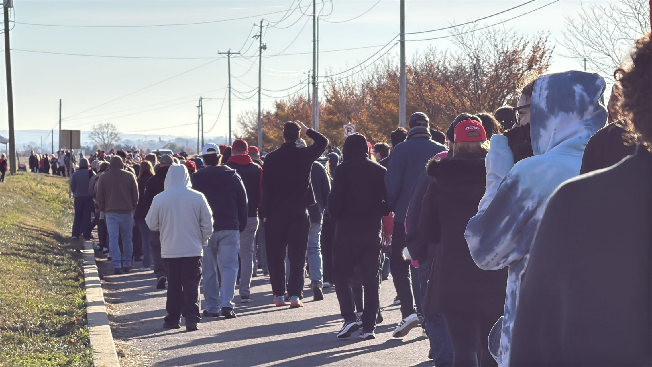 (點新聞 特約記者 權典之 賓州報道)當地時間11月3日上午,特朗普在今屆選舉的關鍵搖擺州賓夕法尼亞州的城市利蒂茨(Lititz)舉行競選集會。集會10點開始,8點多已經有很多支持者排隊,不多時隊伍已有約1公里長,陸續還有人到場排隊。