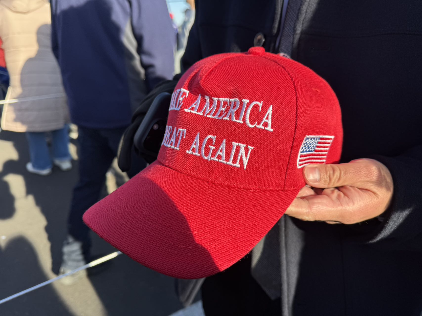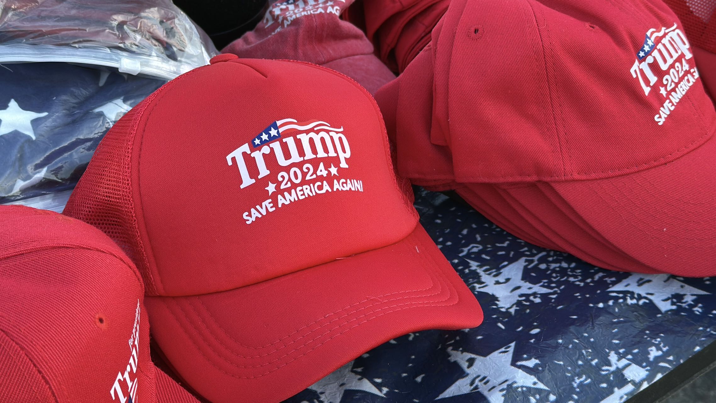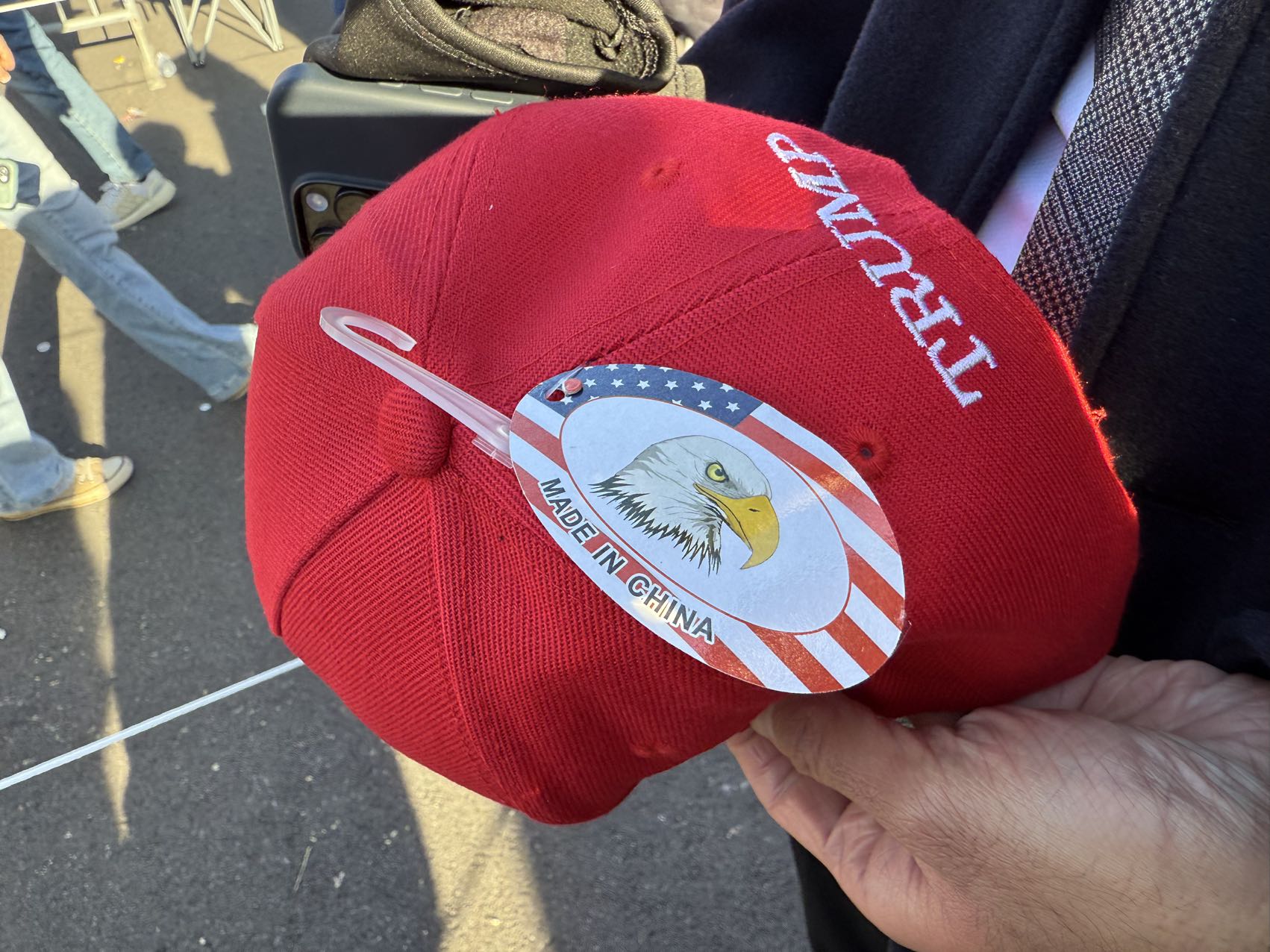 現場排隊人群時不時叫喊競選口號,沿途有特朗普競選紀念品販賣,最搶手的「小紅帽」上印有經典競選口號「Make America Great Again」,帽子印有「中國製造」標籤。