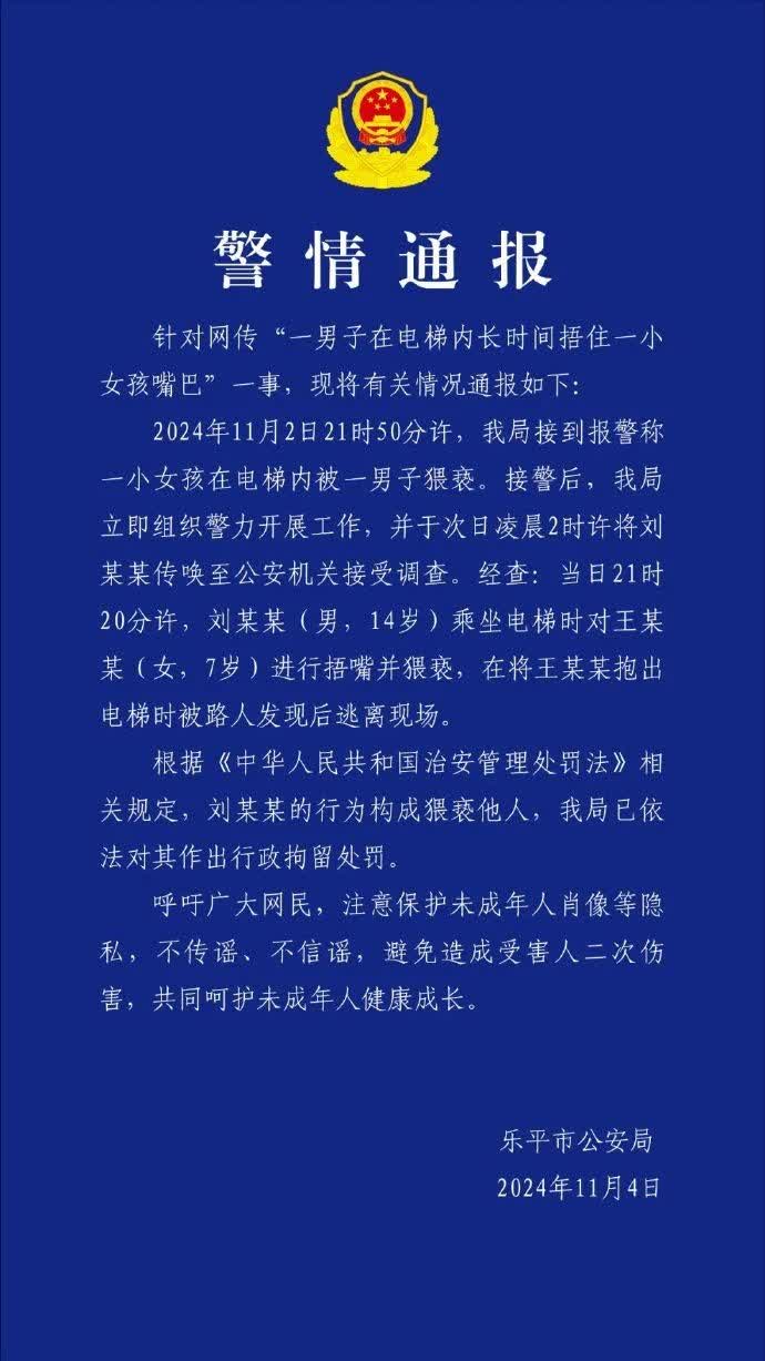 11月4日下午,樂平市公安局發布「警情通報」稱,14歲男孩劉某某對7歲女童王某某捂嘴並猥褻,警方已經對其作出行政拘留處罰。