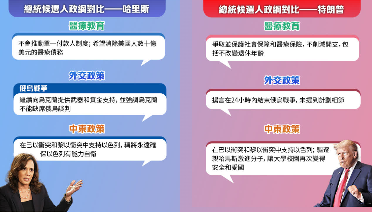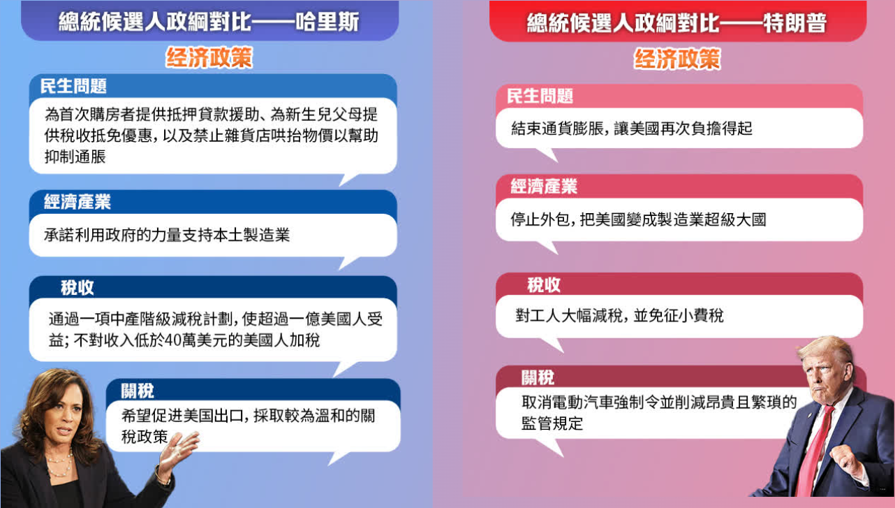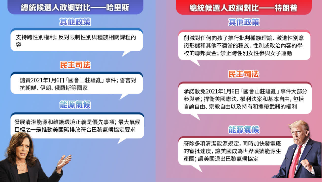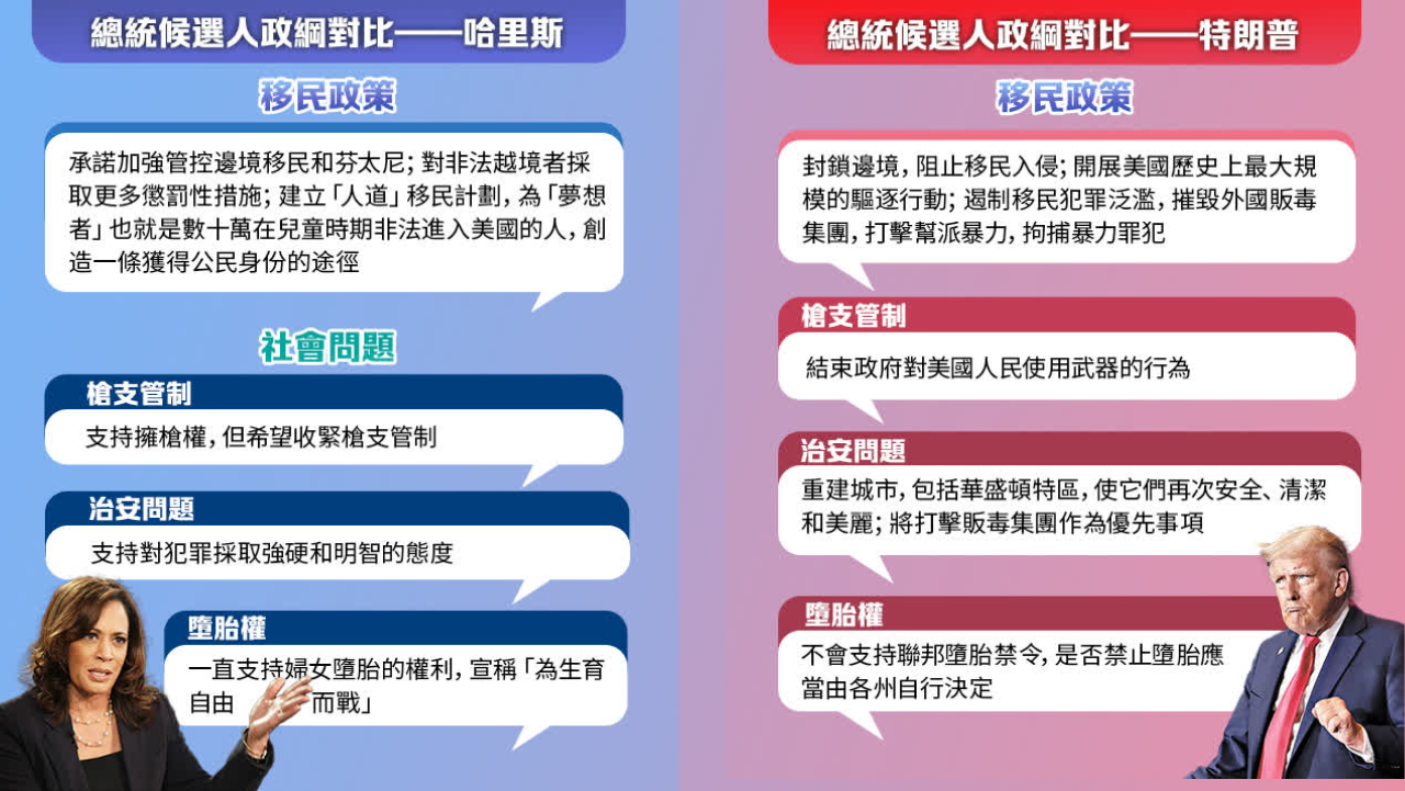 點新聞整理報道,美國總統大選將於明天(11月5日)舉行,民主黨候選人哈里斯及共和黨候選人特朗普的政綱和立場備受關注。點新聞整理了哈里斯和特朗普的政綱關鍵點對比,一文簡述兩人在經濟、移民、外交、民生等方面的異同。