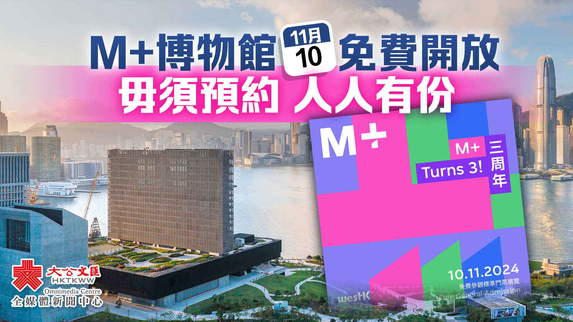 大公文匯全媒體報道,為慶祝開幕3周年,M+博物館宣布11月10日(星期日)將全天免費開放,公眾當天可免費參觀標準門票展覽及公眾節目,毋需預約;購買當天特別展覽門票者可免費到訪位於博物館11樓、平日僅供M+會員及贊助人享用的M+會館。