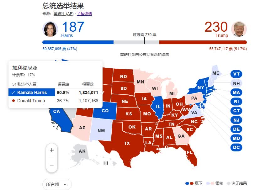 目前,加利福利亞州(54張),哈里斯暫時領先,得票率60.8%。