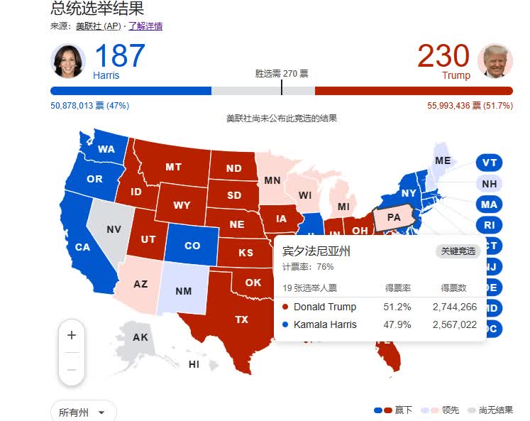 七個關鍵搖擺州內華達州(6票)、亞利桑那州(11票)、北卡羅來納州(16票)、佐治亞州(16票)、威斯康星州(10票)、密歇根州(15票)和賓夕法尼亞州(19票)中,特朗普在賓夕法尼亞州、亞利桑那州、佐治亞州、北卡羅來納州、威斯康星州、密歇根州暫時領先。內華達州(6票)還未開始計票。